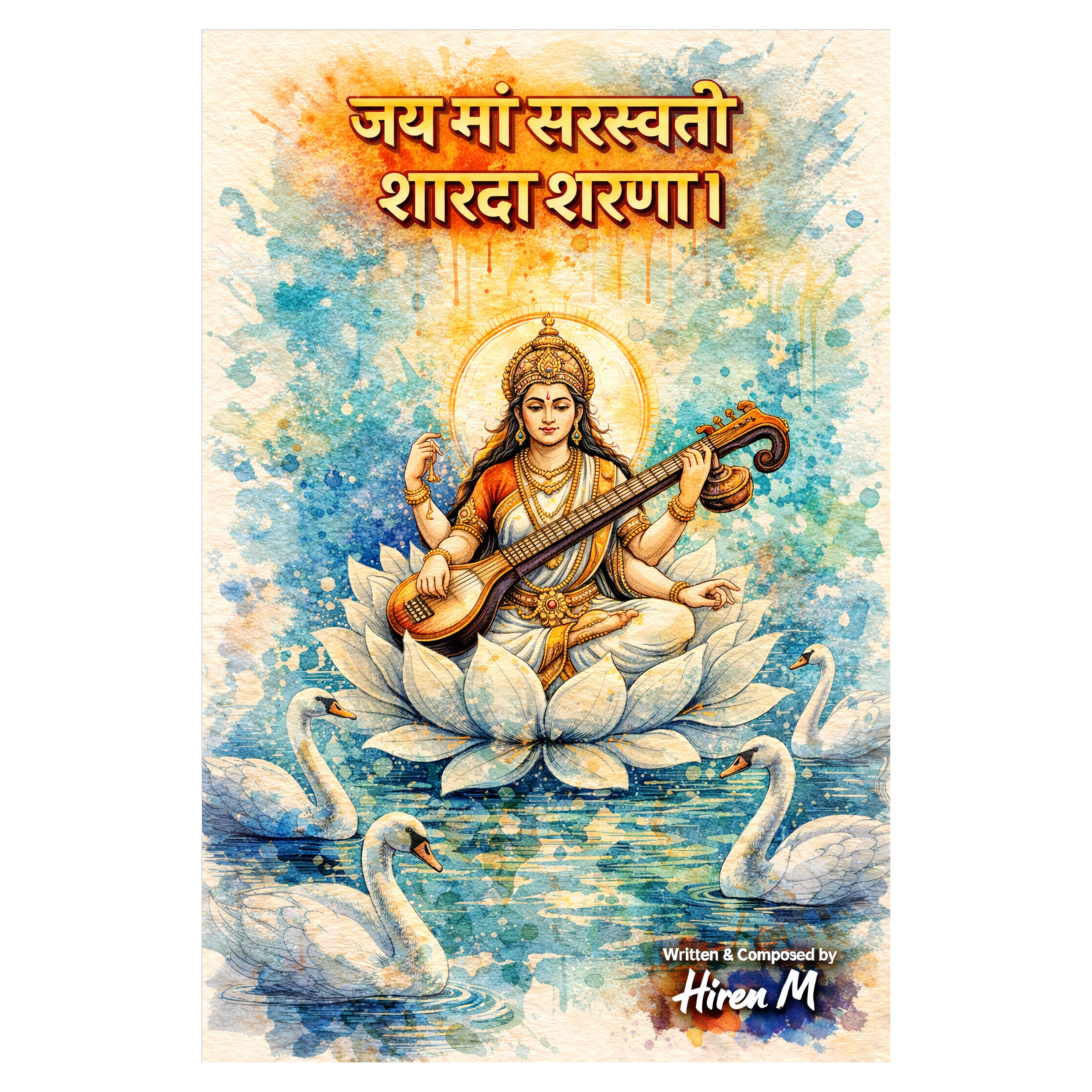 Indian devotional bhajan dedicated to Goddess Saraswati, shanti and vidya bhav, slow to medium tempo, gentle rhythmic flow, female vocal, soft, calm and meditative, tanpura drone with light veena or flute, harmonium accompaniment optional, clear diction, serene temple ambience, knowledge, art, and wisdom mood, reflective and uplifting