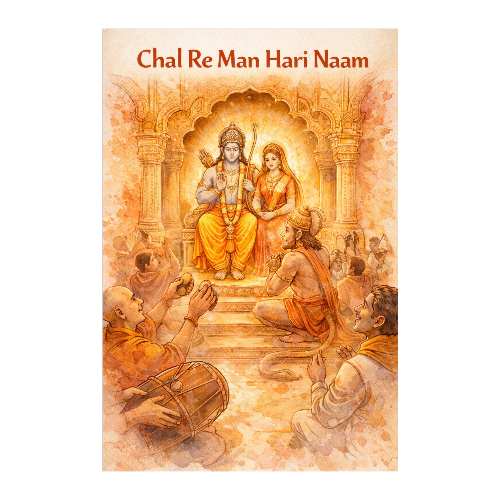 A devotional bhajan music track with a chalti (walking) folk rhythm, rooted in Indian traditional sound but with a fresh twist, Warm, organic, and uplifting mood suitable for satsang or live kirtan, Traditional Indian folk percussion drives the groove, with constant forward motion and gentle swing, Banjo plays rhythmic plucked patterns and melodic hooks, blending naturally with the folk texture rather than sounding western or flashy, Melody should feel simple, repetitive, and chant-friendly, allowing space for group vocals, Overall feeling is grounded, devotional, joyful, and meditative while moving, not fast, not slow—steady and flowing, Sound should feel rural, earthy, and communal, like a village bhajan sung while walking together, Clean acoustic production, minimal effects, natural room ambience, no electronic synths, no modern pop elements, Ends with space suitable for repetitive chanting and gradual fade-out