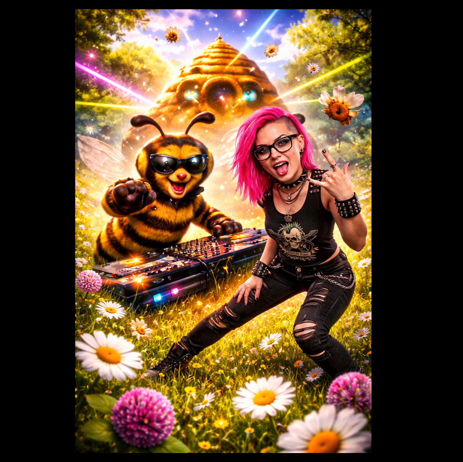 Happy Hardcore, Eurodance Influence, 180 BPM, High Pitched Dune Style Synth, erzerrte aber fröhliche 909-Kicks, Breakbeats im Hintergrund, "Chipmunk-Vocals", Hyperaktiv, euphorisch, bunt, energetisch, A high-energy Happy Hardcore track at 175 BPM, Euphoric and bouncy, Features fast, distorted kick drums, uplifting supersaw melodies, and a catchy synth hook, The atmosphere is frantic and fun, Male high-pitched vocals singing about a bee named Marvin, 90s rave aesthetic mixed with modern hardstyle production, Gabba accents