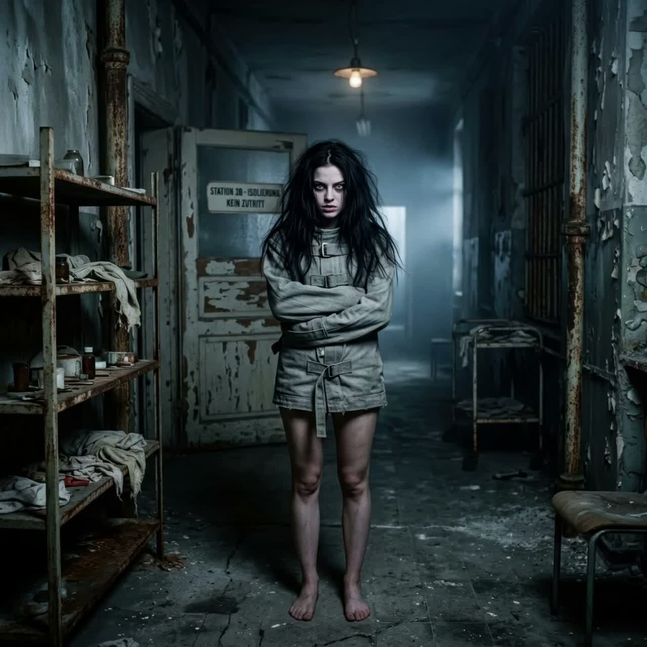 Aggrotech-industrial track with punishing distorted kick, snarling synth bass, metallic percussion, and glitchy layered edits, Female vocals tremble over eerie music-box motifs, detuned e-piano chords, and vast atmospheric pads, Horror textures, industrial noise bursts, and epic, intense low-end drive a relentless, creepy, high-impact mix