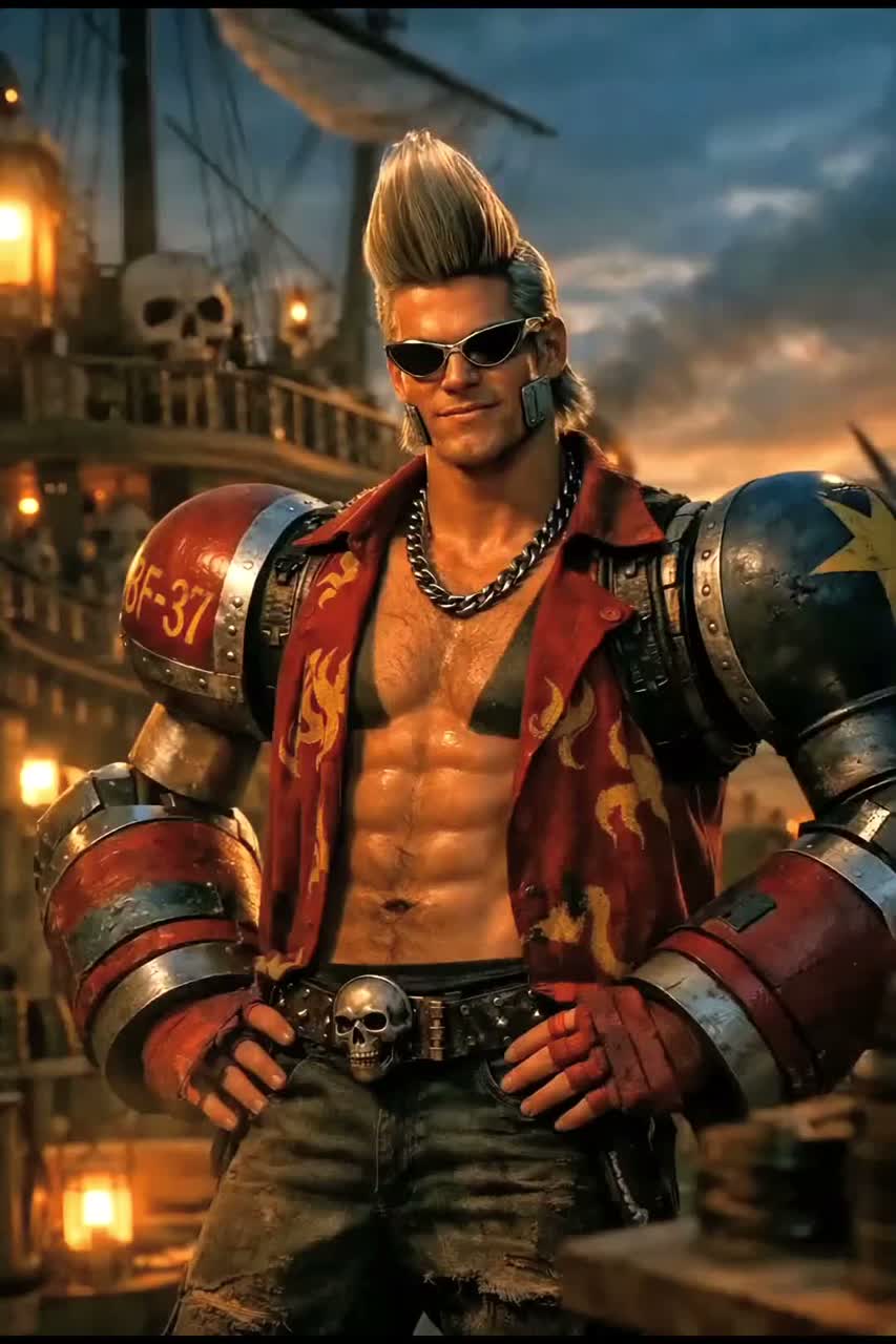A Pirate Metal, Cyberpunk Metal, Nu Metal and Pirate Rock Shanty Song about Franky From One Piece Sung By Scarlet beautiful, confident, expressive, slightly gritty tone, warm Storytelling Female Vocals with playful attitude in verses, powerful, bold emotional delivery, Lead Guitar, punchy, energetic riffs, expressive bends + slides in The Style Of Traci Guns, Rhythm Guitar heavy distorted industrial tone, palm-muted chugging, groove-driven riffs, slightly syncopated for swing feel in The Style Of Izzy Stradlin, Industrial Guitar Layer processed/distorted guitar textures, glitch effects, mechanical rhythm layering, Bass gritty, slightly overdriven tone, groovy, locks tightly with drums in The Style Of Nikki Sixx, Drums hybrid drum kit
