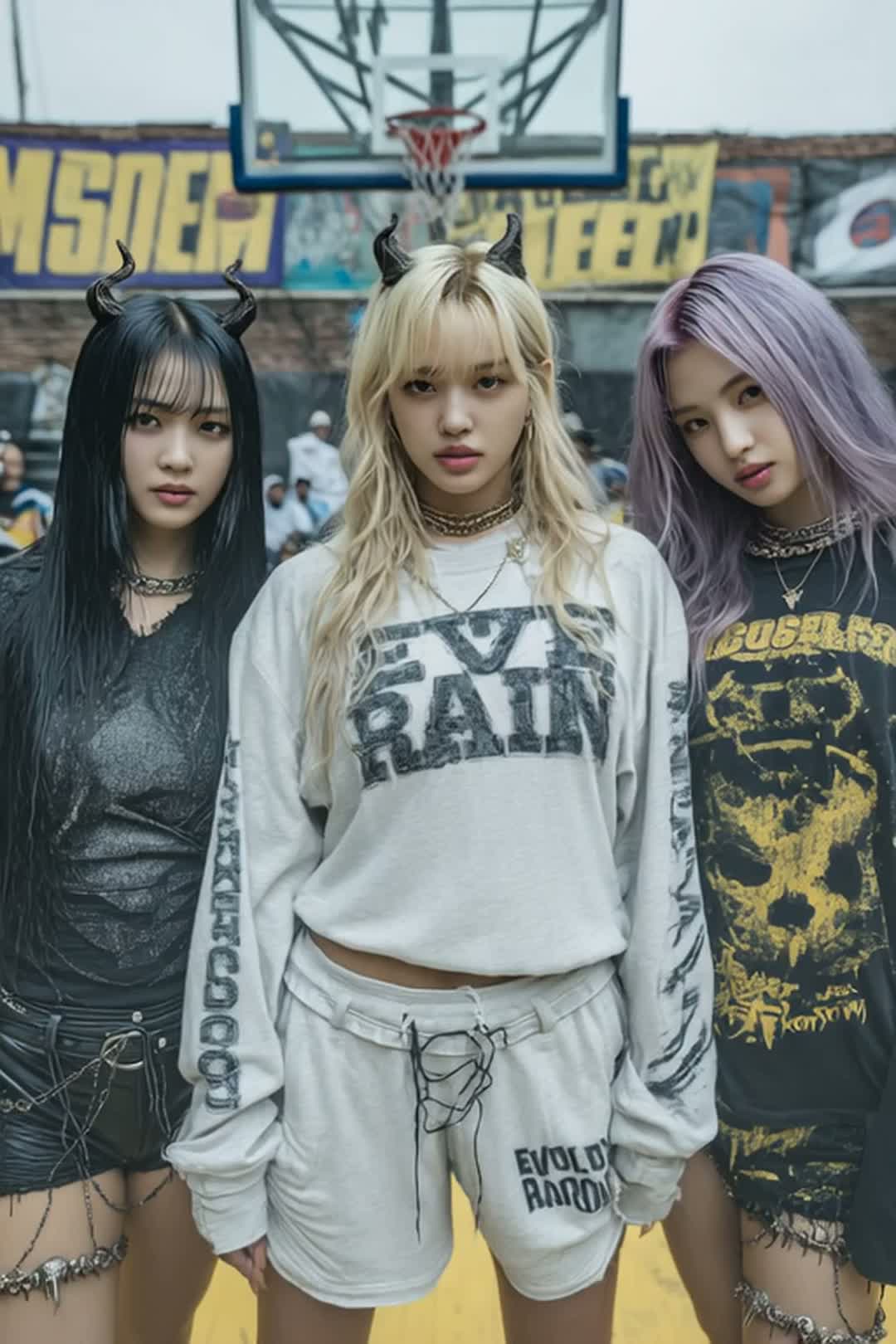Pre-Chorus: Beat softens, a melodic and ethereal synth pad rises to the front, Member 1 sings with a breathy, enchanting tone, Chorus: The hard beat crashes back in, All members deliver the lines with rhythmic, punching force, Bridge: The rhythm becomes a stomp-clap chant, menacing and unified, Verse 2: The beat intensifies with frantic, sharp hi-hats, Member 3 launches into a relentless, breathtaking double-time rap, Verse 3: The beat cuts back to a slow, heavy bass and a deliberate, echoing drum, The flow is cold, arrogant, and final, with all three rappers trading lines, ‑Background Noise, ‑Noise