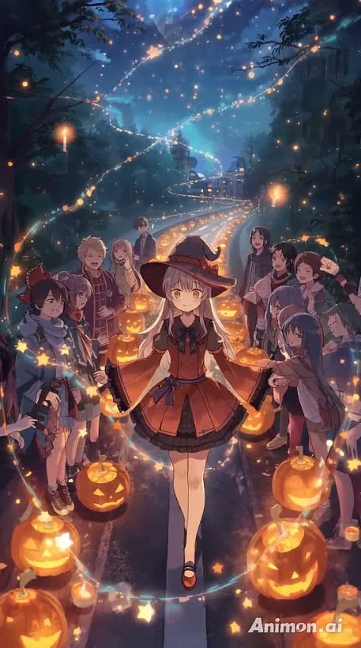 Create an ultra-cute, sparkling, and magical Halloween J-Pop track designed for children to sing along easily, Mood: playful, joyful, glittery, and full of excitement — like kids twirling in pumpkin-colored costumes under a starry Halloween sky, surrounded by candy, lights, laughter, and friendly ghosts, Instruments: twinkling synths, bouncy pop drums, bright electric bass, chiptune sparkles, hand claps, toy piano, bell glissandos, and shimmery “fairy dust” effects, with occasional sparkly glockenspiel and whimsical sound cues, Add fun motifs like “ding!”, “boo!”, “ha-ha-halloween!”, “trick-treat!”, giggles, and laugh cues rhythmically to enhance energy and interactive fun, Vocal: high-pitched, clear, and expressive female lead with simple, catchy lines, layered harmonies, and playful background vocals, From Chorus2 onward, include lively children’s choir-style vocals singing in unison and harmony to create a joyful, festive, and interactive Halloween experience