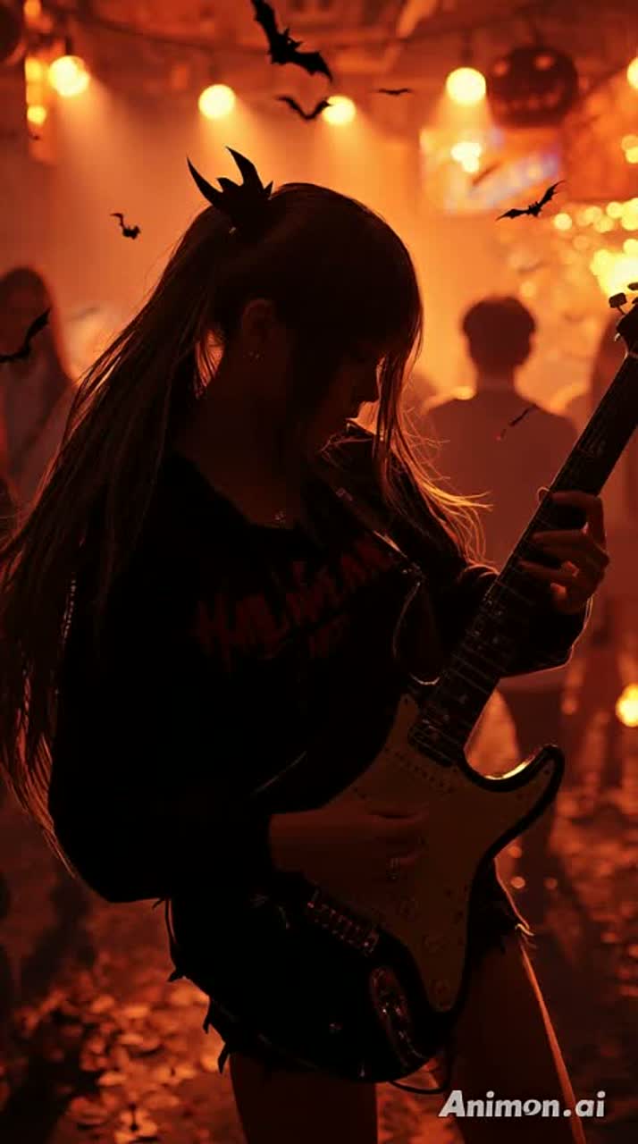 Fast tempo (around 140 BPM), electric guitar-driven rock groove with thick, layered guitars inspired by virtuoso rock guitar styles, funky bass, and dynamic drums, Layered synth textures inspired by psychedelic rock, combined with experimental beat changes and danceable rhythm, Bright orange and black Halloween night atmosphere, teenage friendship and unity through music, Emotional and youthful Japanese female main vocal performance, energetic and slightly raspy tone, expressive phrasing with rhythmic vocal hooks, Subtle hip-hop elements: rhythmic vocal phrasing, groovy bass, and experimental reverb transitions, Powerful chorus with wide stereo guitars, big drum hits, and echoing backing shouts, featuring fast, melodic, and virtuosic guitar licks reminiscent of legendary rock guitar playing, with male vocals prominently layered in the chorus for contrast and depth, Live band energy with a sense of youth rebellion a