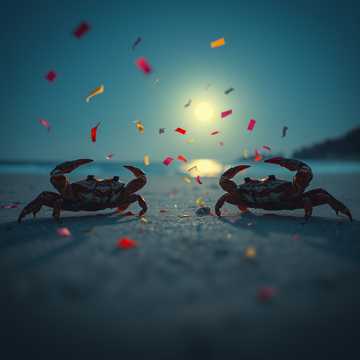 This is an upbeat jazz-ska track (128 BPM, key A minor), Instrumentation: off-beat guitar chops, walking double-bass, swinging shuffle drums, bright brass section (trumpet/tenor sax/trombone), vibraphone stabs, hand-claps, soft surf-bubble SFX, Vocals: energetic female lead with gang-shout call & response and short scatting phrases, Mood / Imagery: “leaf-litter forest by day, moon-lit beach parade by night; red-clawed crabs releasing zoea like confetti”, Structure: 2-bar horn count-in → Verse 1 → Pre-Chorus → Chorus → Verse 2 → Pre-Chorus → Chorus → Bridge (scat mnemonic) → Double Chorus (½-step key-up) → 2-bar brass outro