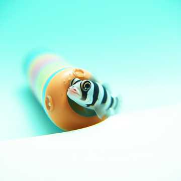 This is a sunny ukulele-reggae pop song (110 BPM, key C major), Instrumentation: percussive ukulele strums, mellow electric-piano comping, marimba taps, deep but soft reggae bass, light cajón & shaker groove, muted-trumpet fills, whistle hook, tiny bubble SFX, Vocals: breezy female lead with layered hum harmonies and a short whistle break; no rap or shout sections, Mood / Imagery: “bright pier morning; a striped blenny popping its head from a pipe, posing for the camera, ”