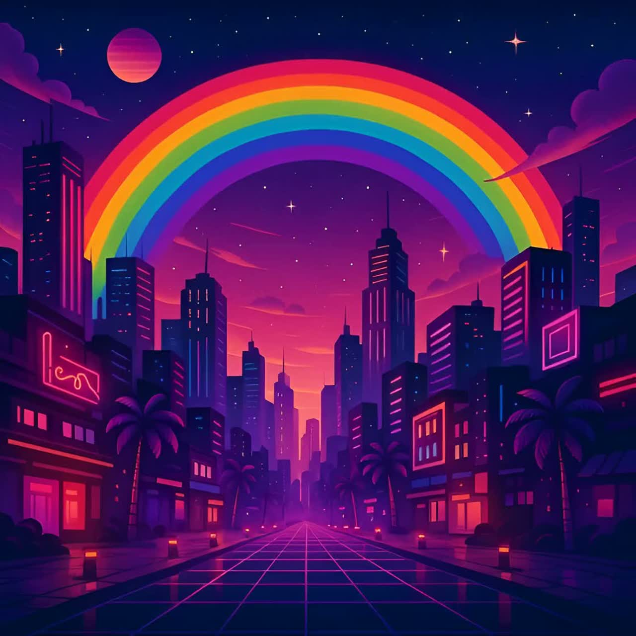 An energetic blend of 1980s-style synth-pop with bright analog leads, punchy LinnDrum beats, and shimmering retro pads, Melodic hooks and vocoder harmonies give the track its nostalgic charm, while a driving bassline and gated reverb snare create motion, Built for high energy with touches of surreal playfulness, the song evokes neon-soaked nightscapes and dreamy arcade-lit adventures, ‑Lo-fi, ‑Acoustic, ‑Folk, ‑Ambient, ‑Chillwave, ‑Grunge, ‑Trap, ‑Country, ‑Jazz, ‑Classical