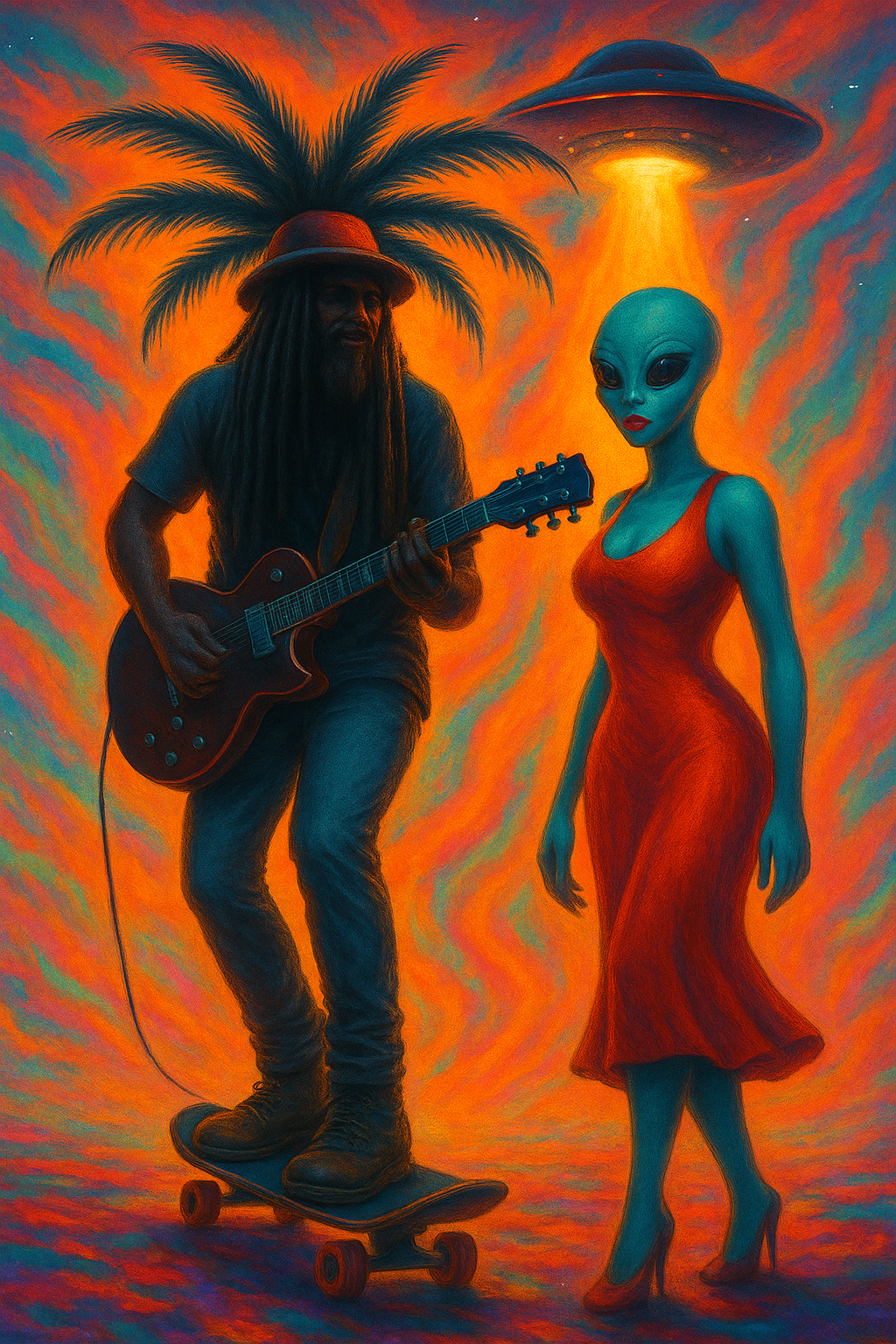 experimental, reggae, brostep, metalcore, heavy synth, hard riffs, psychedelic, alien, adlibs, deep bass, riffs, electric guitar, ragga, effects, proper mixing, crisp sound, wide stereo
