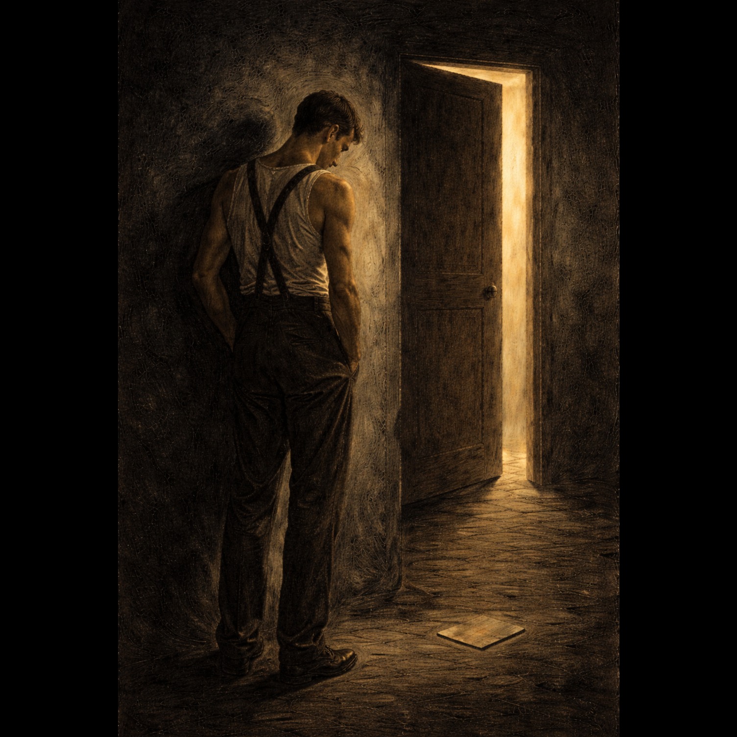A dark fusion of dark wave, electro rock, New Wave, alternative rock with an oppressive, anxious atmosphere and a sense of latent menace, Built around guitar, bass guitar, trumpet and drums, with cold, rigid guitar ostinato driving a ritual-like, unsettling cyclic motif, The trumpet functions as a distant, mythological signal cutting through the texture like a call from the fog, Synth layers create a claustrophobic, misty soundscape reminiscent of a northern sea, frozen time and autumnal decay, Male vocal, young, soft but tense, within a range of up to three octaves, fragile yet emotionally restrained, sounding like a compulsive incantation rather than expressive singing, Mood: dark, anxious, cold, hypnotic, ominous, No brightness, no pop gloss, no warmth, Focus on tension, repetition, and slow psychological pressure