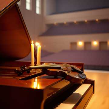 Romantic concert hall ambience; intimate solo piano and lyrical high-register violin, Slow–moderate tempo with flexible rubato, bel canto phrasing and deep, unhurried vibrato, Piano leans on luminous arpeggios, delayed cadences, and warm diatonic color shifts; violin sings long, arching melodies with tasteful portamento, Dynamics stay tender and restrained; final minute gradually thins with morendo, pedal shimmer, and fragile harmonics until almost glowing silence, deep, emotional, harmony, romantic, slow, gentle, dynamics, soft, tone, warm, bright, violin