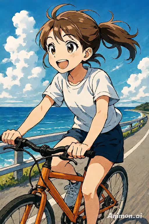 fast and bright Japanese summer pop, cute and energetic female vocal, high tempo, emotional and youthful, feels like a summer adventure, riding bicycles with friends, sparkling sunlight by the sea, light electric guitar, crisp drums, catchy chorus, airy synths, chorus harmony, anime-inspired, summer memory vibe