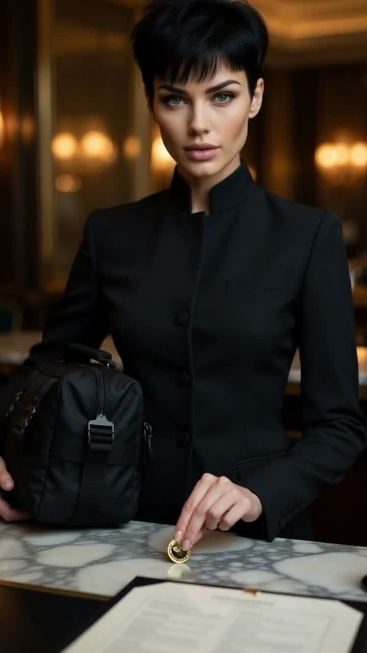 Cinematic Darkwave with Haunting Solo Piano, 110 BPM, Aggressive rhythmic piano arpeggios, staccato noir piano melodies with long plate reverb, minor key tension, Deep driving sidechained Moog-style sub-bass, pulsing analog modular synthesizers, Heavy industrial drum machine kicks, sharp metallic claps, Gritty distorted bass stabs, high-tension cinematic string layers, distant haunting female background choirs, Glitchy granular synthesis, dark vocal chops, Performance: Cold Female Vocals, 27-year-old voice, smooth breathy delivery, whispering verses, NO shouting, Performance is intimate, professional and deadly, Atmospheric neo-noir despair, hypnotic rhythmic precision, High-fidelity spatial audio, 2026 modern dark action movie score aesthetic, high-octane electronic assassin-noir soundtrack