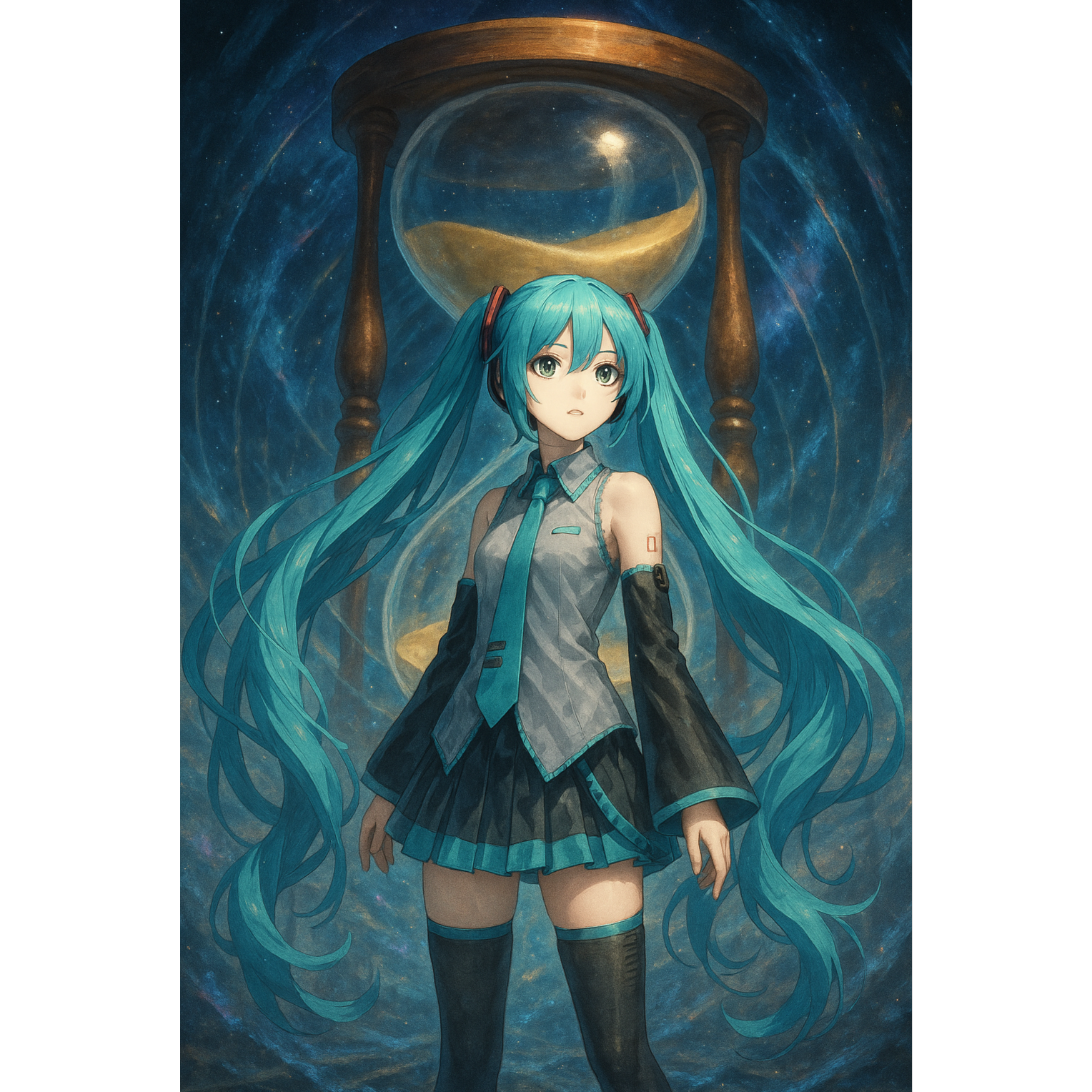 Powerful rock concert anthem performed in a huge arena, filled with a roaring audience, Strong electric guitars, heavy drums, and driving bass with explosive live energy, Vocaloid-style female vocals similar to Miku, high-pitched, sweet and clear, with vocoder and robotic vocal effects, Energetic, dynamic, and futuristic atmosphere with the excitement of a live performance, crowd cheering, and spotlight stage presence, Arena rock sound with an electronic twist, blending J-rock and Vocaloid vibes