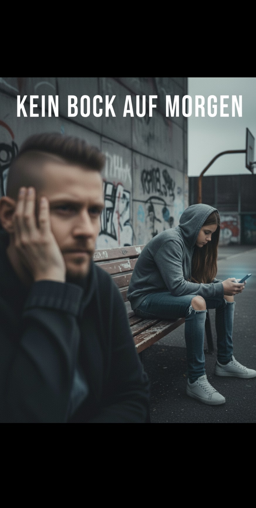 A dark Deutschrap trap track featuring sparse, menacing beats driven by deep 808s and crisp hi-hats, Layers of sinister synths and industrial textures set a moody atmosphere, Deep male vocals cut through with a harsh, gritty edge, alternating between punchy verses and spacious drops