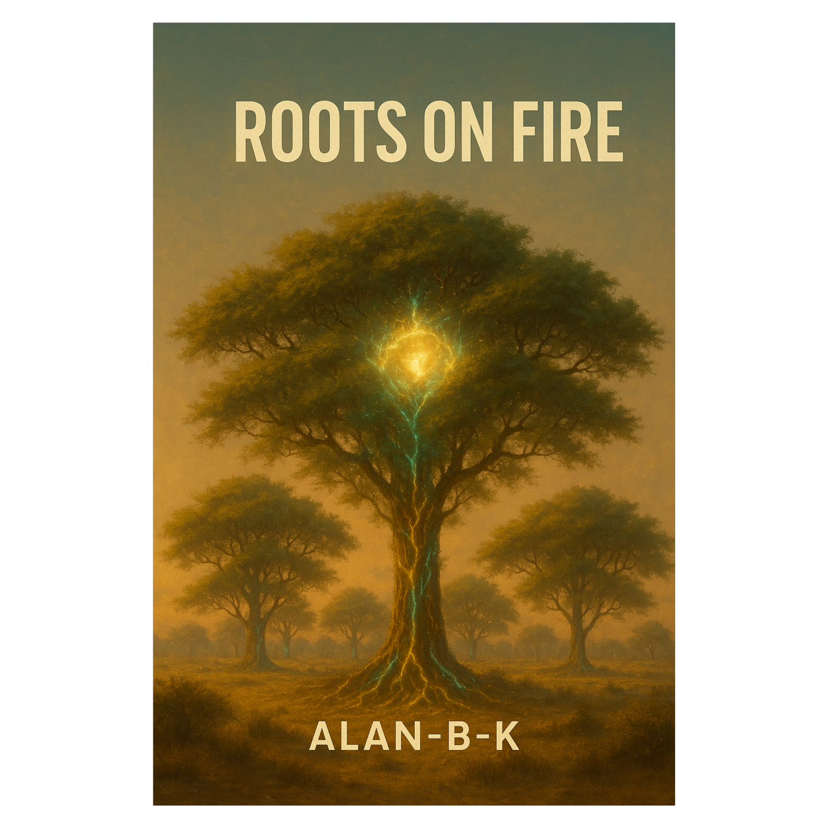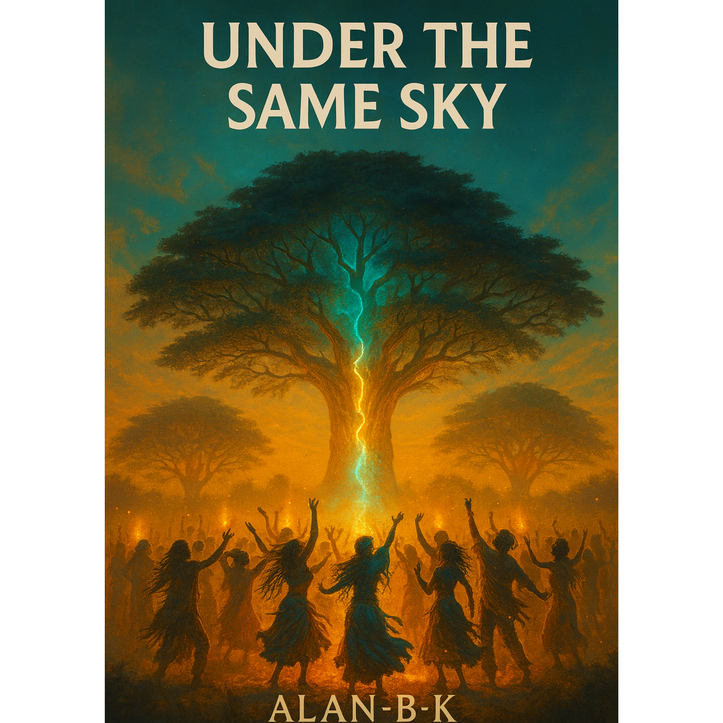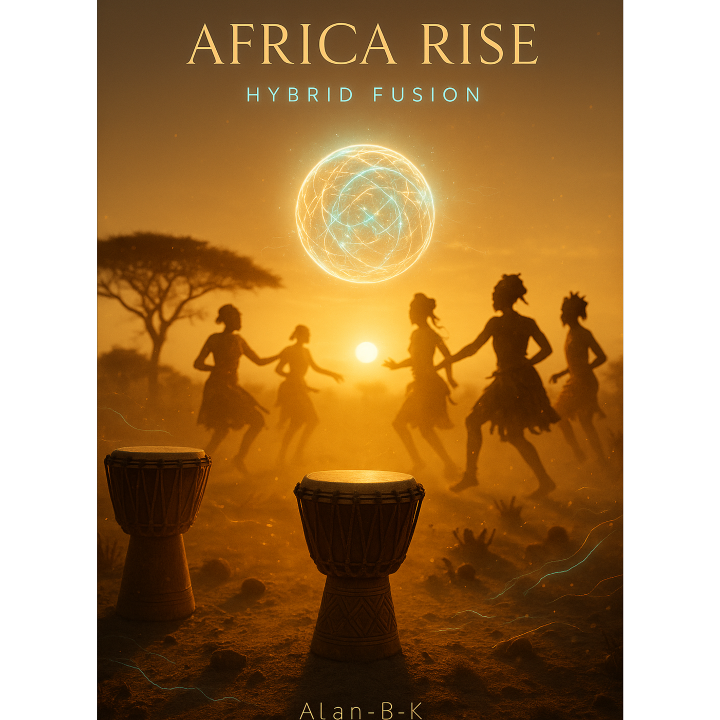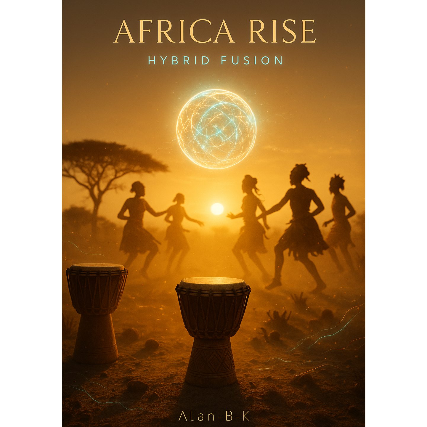 Hybrid roots-fusion at 132 BPM, triumphant and cinematic, Distant drums echo across the savanna, layered with shakers and congas that build like a heartbeat of the land, Horns rise through the haze — a call answered by deep rolling bass, The one-drop pulse locks in, rimshots crisp, hi-hat shimmering, acoustic guitars glowing in delay, Hammond organ bubbling beneath, Airy Goa-style arps drift like heat mirages above the groove, A powerful male lead begins with verses of struggle and renewal; the female choir answers in radiant harmony, Midway, a rap/toast verse ignites — fierce, rhythmic, filled with roots wisdom, The bridge swells into chants: “Africa rise! Africa strong!” echoed by the crowd, horns blazing, percussion surging, Final chorus bursts into full unity — bass, drums, horns and voices glowing together, Dub trails fade into the open night, A continental heartbeat reborn — proud, spiritual, unstoppable, unmistakably Alan-B-K