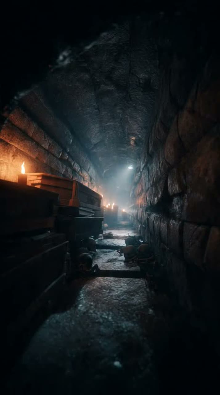 Dark atmospheric Techstep with strong witch-house influence, Industrial 170 BPM drum & bass with cold mechanical drums, deep reese bass, and cavernous sub-rumble, Huge ritualistic atmosphere inspired by underground caves: echoing pads, reversed whispers, dripping-texture sound design, and trembling metallic percussion, Massive reverb, detuned synths, and slow half-time occult melodies create a claustrophobic, cinematic horror mood, ‑R&B, ‑Metal, ‑Hardrock, ‑Rock, ‑Pop, ‑Reggae