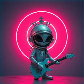 Create a full song blending 1970s theatrical glam rock with modern dark pop / alt-R&B, Male vocalist with high, dramatic, androgynous delivery, theatrical phrasing, nasal tone, heavy echo and reverb like he’s singing in deep space, Instrumentation: crunchy, staccato palm-muted electric guitars, massive layered guitar solos full of bends and distortion, deep 808 bass and sub drops, crisp trap-style hi-hats and snappy snares, shimmering atmospheric synth pads, eerie string-like synth leads that sound like warped theremin, distorted megaphone backing vocals, subtle reversed tape effects and vinyl crackle throughout, Tempo 110-120 BPM with a swinging glam groove that drops into a half-time, moody chorus perfect for a neon-lit nightclub on another planet, Include distant, panned cat meows as a quirky recurring motif and one huge roaring guitar swell right before the final chorus, Overall mood: tragic, glitter-dusted alien rockstar heartbroken in a futuristic underworld; equal parts ear