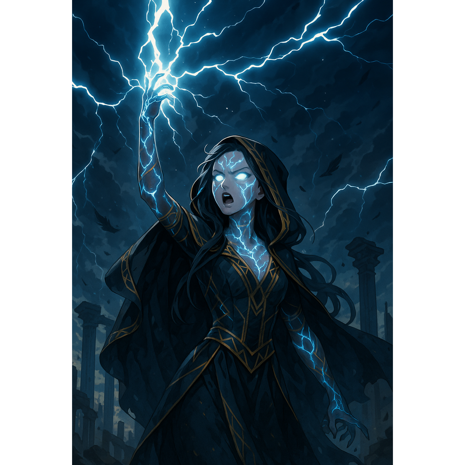 A high-tempo dark EDM track fused with epic orchestral elements and cyberpunk textures, Female vocals deliver intense and electrified energy, starting with calm determination and building toward explosive, storm-like choruses, Incorporate thunder and lightning sound effects, pulsing synth basslines, glitchy elements, and dramatic string stabs, The theme centers on divine judgment and spiritual wrath, as if a goddess channels lightning through her veins to cleanse deception and imbalance, The mood is fierce, majestic, and mystical—like a Valkyrie summoning cosmic thunder to strike with sacred fury, Dynamic drops and aggressive beat sections emphasize power and clarity, Modern, cinematic, and powerful