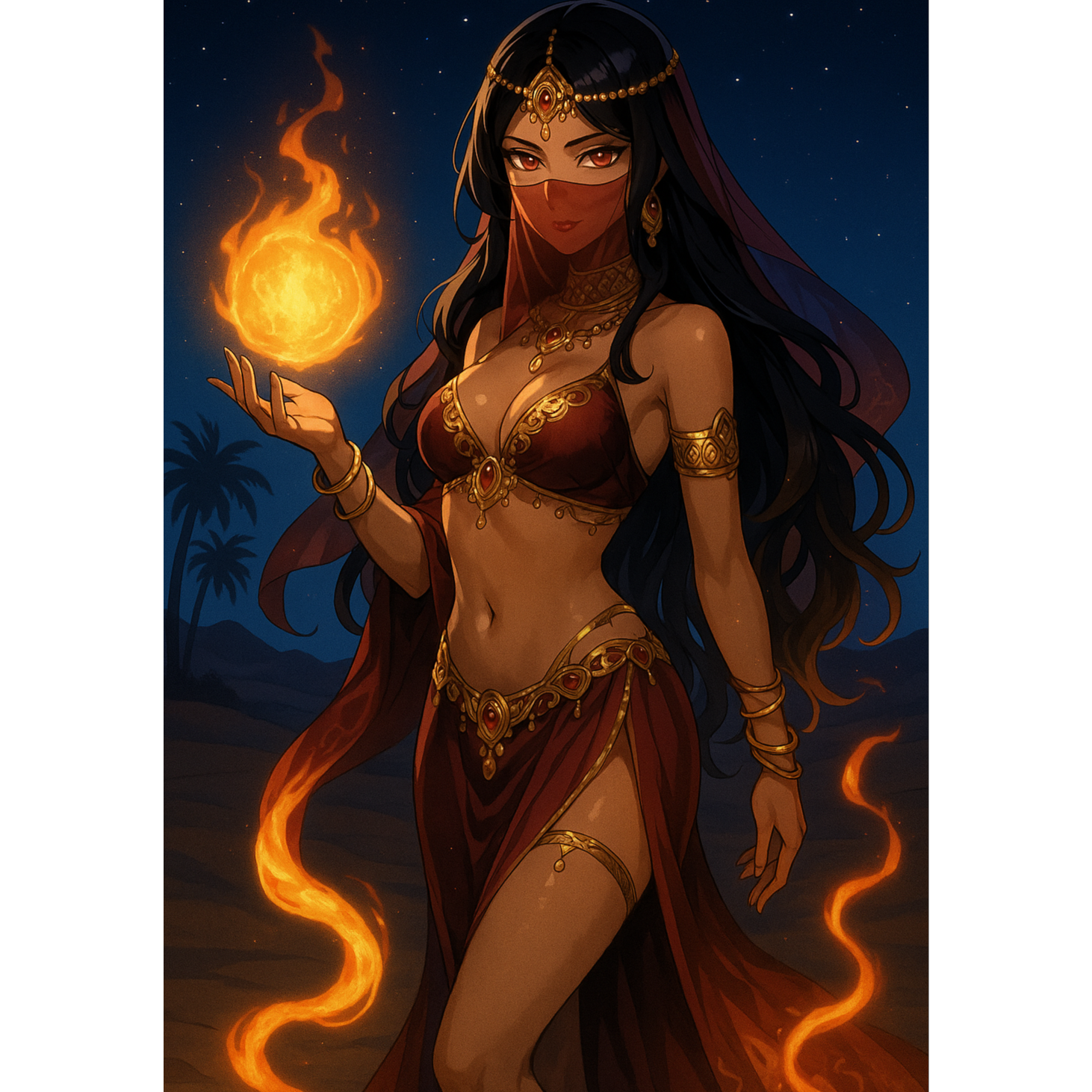 A dark, seductive Arabic-electro cinematic pop song titled “Oasis of Fire, ” The track blends sensual Middle Eastern instrumentation (oud, darbuka, strings) with hypnotic modern synths and haunting pads, The female vocalist embodies a divine, veiled goddess of desire and judgment, offering lovers a paradise laced with danger, She welcomes only the worthy into her sacred oasis—those who deceive are scorched by her fire, The verses are sultry and slow, the chorus explodes with power and mysticism, Themes: divine femininity, temptation, sacred wrath, hidden truth, No artist name, no Arabic language