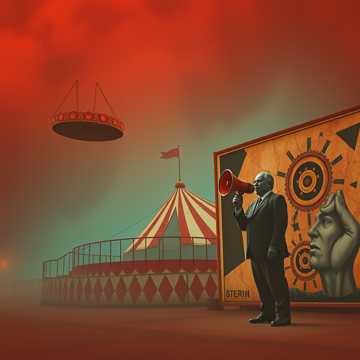 Tempo: mid to gast 118/122 BPM, Instrumentation: aggressive lo-fi drums, distorded guitars, distorted bass, fuzz guitar, gritty analog synths, glitch noise, feedback bursts, broken carnival organ, detached, slightly lazy male vocal, talk-sung verses, melodic chorus, Male vocals with a detached, lazy delivery, half-spoken half-sung, slightly robotic, emotionless but intense, underground art-rock, electro-punk-post-garage dark and dramatic, carnival-inspired textures