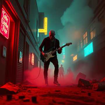 Experimental indie electro disco lo-fi Art pop with a légendaire guitar riff, post punk garage rock revival, dark wawe, indie synth punk, raw lo-fi production, dark and meditative atmosphere, raw and chaotic energy, underground art-rock vibe