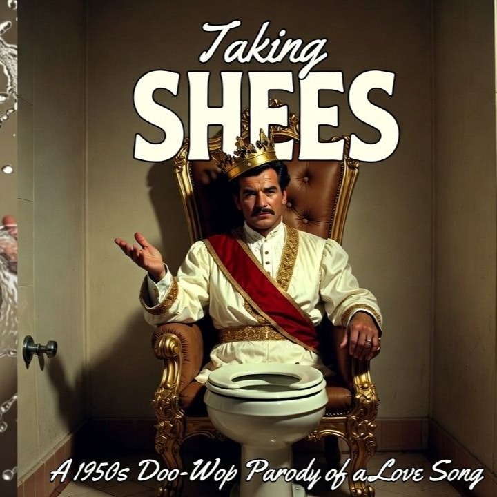 A mid-tempo, humorous doo-wop and barbershop quartet arrangement featuring a prominent baritone lead vocal supported by tight, four-part vocal harmonies, The instrumentation is minimal, consisting of a rhythmic acoustic guitar strumming jazz-influenced chords and a subtle, walking double bass line, The lead vocal is expressive and theatrical, utilizing wide vibrato and dynamic shifts, The harmonic structure follows a classic I-VI-II-V progression in a major key, typical of 1950s vocal pop, The production is clean with a light plate reverb on the vocals to simulate a vintage studio environment, The tempo is approximately 90 BPM with a swinging, triplet-based feel, The song structure includes a recurring melodic hook and narrative verses that build in intensity through vocal layering