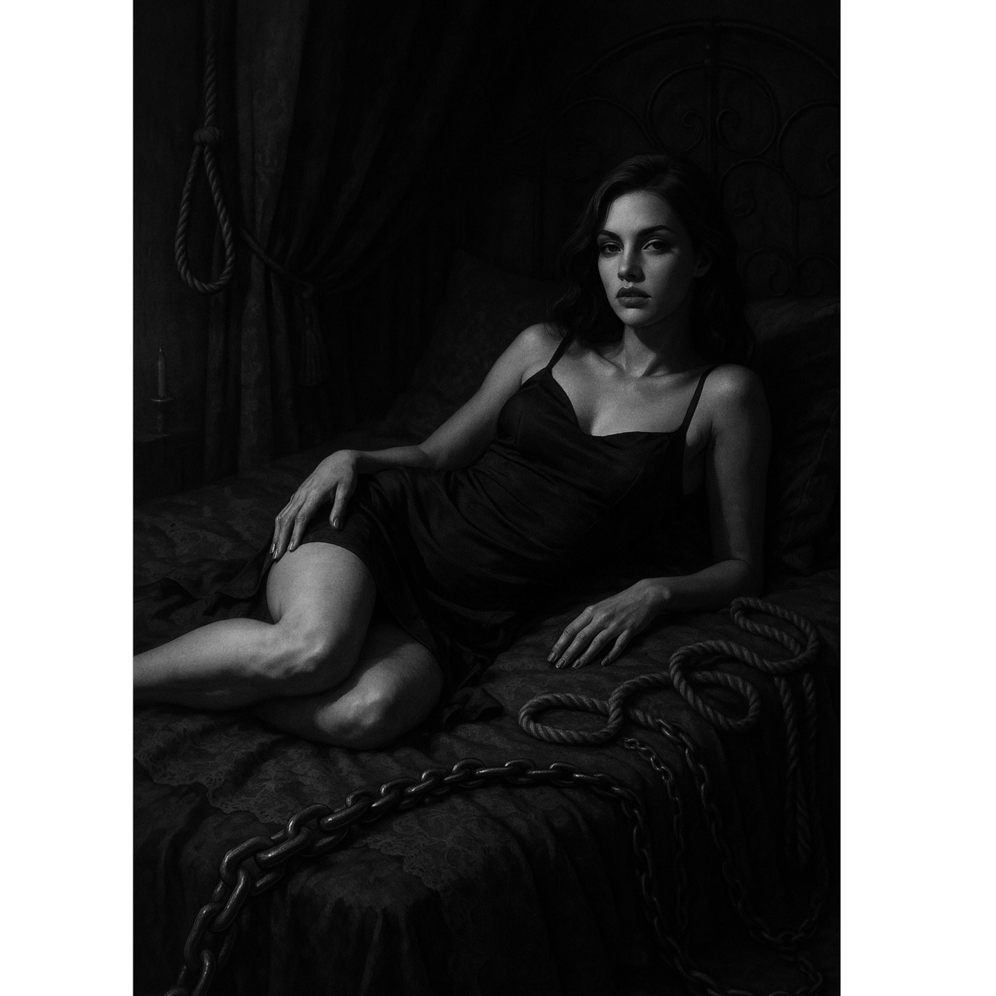 Genre: industrial hard rock with a seductive female lead, Confident, smoky female vocal with fierce attitude and edge, Tempo around 102 BPM, minor mode, Layered distorted rhythm sections with metallic grit; chugging riffs blended with processed synths for a cyber-mechanical texture, Heavy bass distortion locked to pounding live drums and electronic percussion hits, Verses keep a tense, hypnotic groove; choruses hit wide and explosive with stacked guitars and harmonized vocals, Bridge introduces industrial noise elements and a powerful build to the finale, Production dense, modern, and aggressive with saturated analog feel, Mood: dangerous, sexy, and commanding—dark energy and raw confidence; pure industrial hard-rock seduction without softness or explicitness