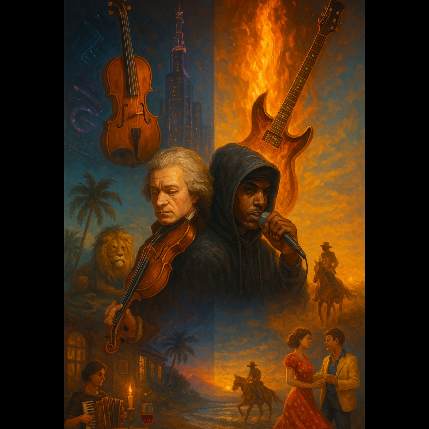 1 republic and benson Boone feat X ambassadors, sound collage, quirky indie folktronica track with staccato percussion, distorted basslines, and experimental vocal layering, Lead vocals should be slightly nasal, expressive, and occasionally break into whispered or shouted phrases, Use shifting dynamics to build tension—quiet, soothing verses and chaotic, explosive, upbeat choruses, Incorporate subtle folktronica textures and off-kilter harmonies to create an unsettling yet catchy atmosphere, Male Vocals, massive vocal runs, impressive breathy falsetto