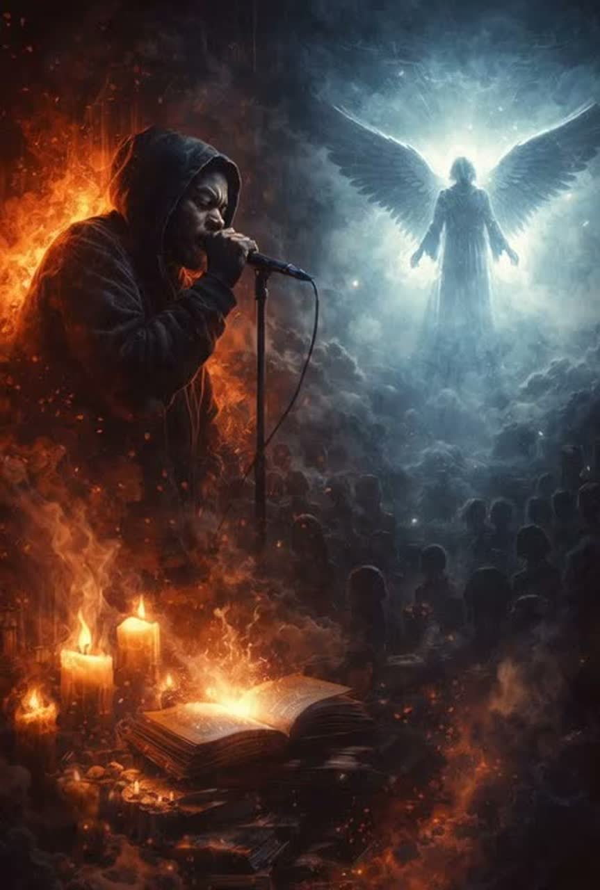Start with a moody orchestral hip-hop intro using gospel hums, low strings, and ambient textures, For the Verses, use classic 90s-style West Coast boom bap with atmospheric piano, gritty vinyl crackle, and layered storytelling drums, In the Chorus, shift into cinematic gospel-trap fusion — add emotional choir harmonies, soaring strings, and deep 808s to uplift the energy while keeping it soulful, For the [Rapid-Fire] sections, transition into modern aggressive trap with double-time hi-hats, tight snares, distorted sub-bass, and glitchy vocal chops to amplify intensity, The Bridge should strip back to ambient textures, lo-fi filtering, soft reverb, and heartbeat-like kick drums, End with a slow orchestral outro, fading out with strings and whispered vocals, to mirror inner reflection and emotional aftermath