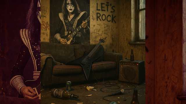 Groove-heavy hard rock anthem with a swaggering mid-tempo riff and explosive 90s metal energy, Verses feature punchy guitars and gritty vocals with blues-rock phrasing, Choruses include gang vocals and drop into half-time chugs with stomping drums, Guitar solo begins with 70s–style delay and phrasing, then erupts into 90s metal–style dive bombs, squeals, and chaos, Tone is wild, rowdy, and celebratory — like a backstage afterparty turned barroom brawl, Include FX like amp feedback, bottle rolls, mic tips, and background laughter in the outro, Vocal delivery should be brash, loose, and charismatic