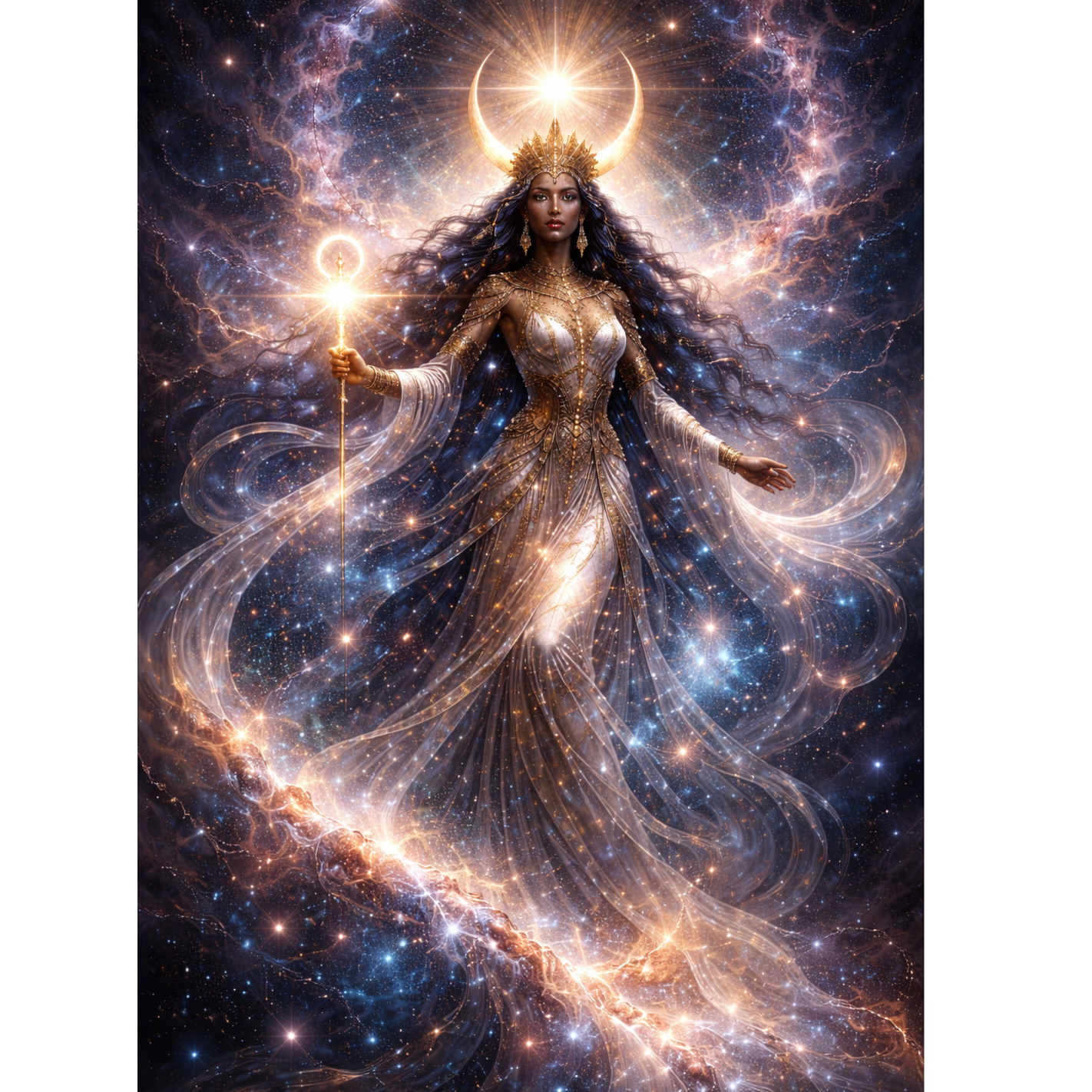 Cosmic ambient ritual layers microtonal, glacial 65-75 BPM pads tuned to 432Hz, radiating with crystalline chimes and glass harmonics that trace Isis energy, Deep infrasound pulses and reversed water sample textures evoke Nile rebirth, while fractal polyrhythms swirl with ghostly gongs and stellar reversed whispers, The pulse of Sirius A blazes amid hidden white dwarf heartbeats, all submerged in vast reverb, The soundscape ascends to a blinding ecstasy, collapses into cosmic void, revealing transcendent, otherworldly textures and profound starseed frequencies, No dominant drums; everything breathes in immense, eerie space