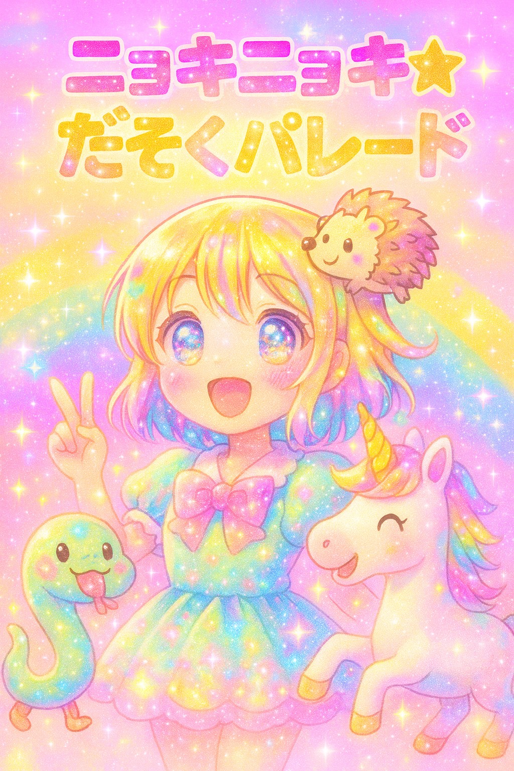 Intro with toy piano and bouncy synth, playful idol calls, Verse bright childlike female vocal with pop synths and clapping, Pre-Chorus builds with snare rolls and chanting, Chorus upbeat denpa idol style, fast tempo, call & response with handclaps, Verse 2 playful narration tone, toy sounds, Pre-Chorus dreamy build, Chorus bigger with audience energy, Verse 3 whimsical and cute, Pre-Chorus magical, turning into unicorn, Bridge chaotic denpa with random sound effects, playful shouts, Final Chorus full power, parade vibe, big colorful finale