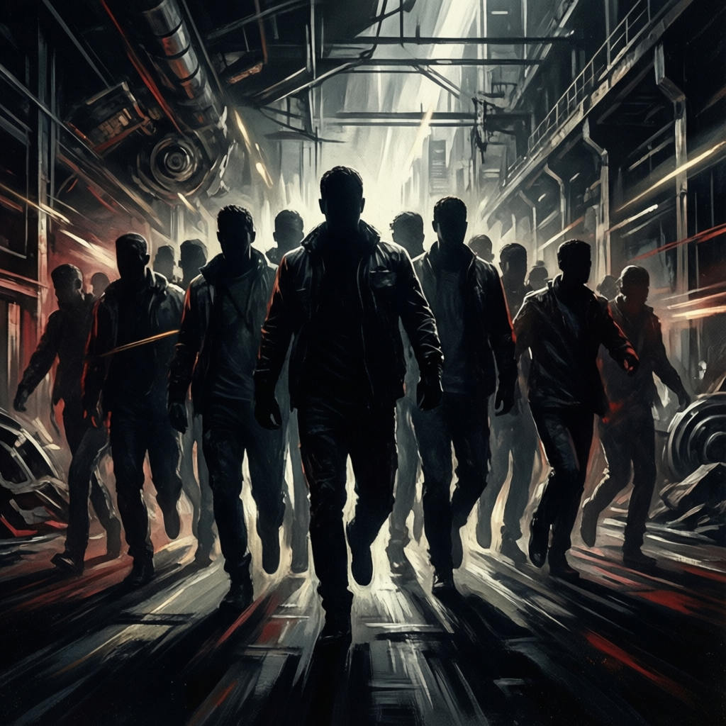 Dark, driving melodic rock, Mid-to-up tempo with tight groove, Punchy drums, prominent bass, sharp rhythmic guitars, Baryton male vocal with assertive delivery, Short, chant-like chorus designed for crowd participation, Minimal atmosphere, high rhythmic focus, Clear melodic hook with aggressive edge, Musical motif from previous tracks returns in simplified, forceful form, Direct transition into next track