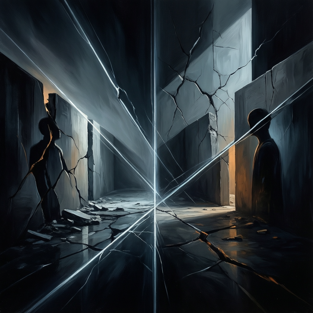 Progressive rock with dark melodic core, Mid-tempo shifting toward tension, Groove continues from previous track but becomes more angular, Layered guitars with subtle dissonance, dynamic bass movement, restrained but expressive drums, Psychedelic undertones, atmospheric textures, Vocal delivery controlled with rising intensity, Musical motif from earlier tracks reappears slightly warped