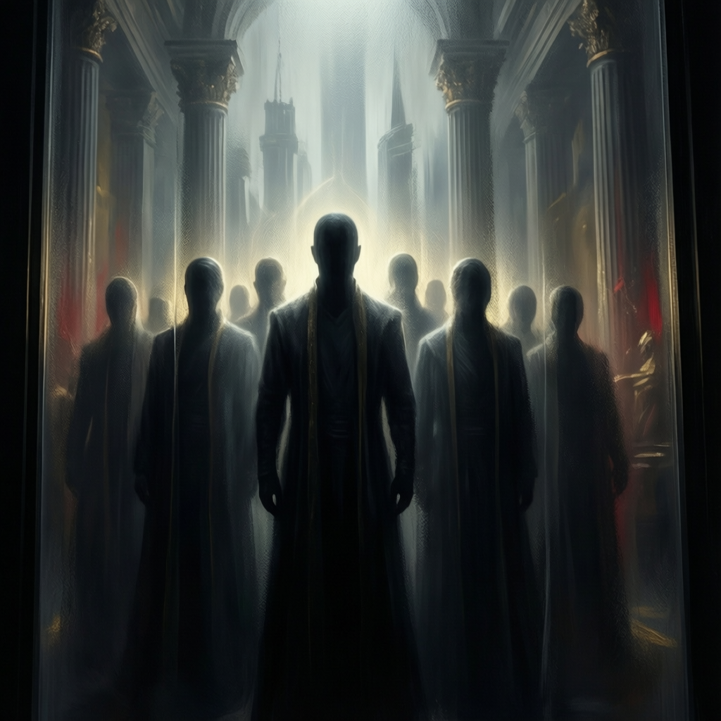 Cinematic progressive rock with orchestral elements, Mid-to-slow tempo with heavy rhythmic pulse, Dark strings, low brass textures, layered guitars, powerful drums, Epic but restrained atmosphere, Strong sense of control and tension, Musical motif from earlier tracks expanded into grand, dramatic form, Smooth transition potential into next track