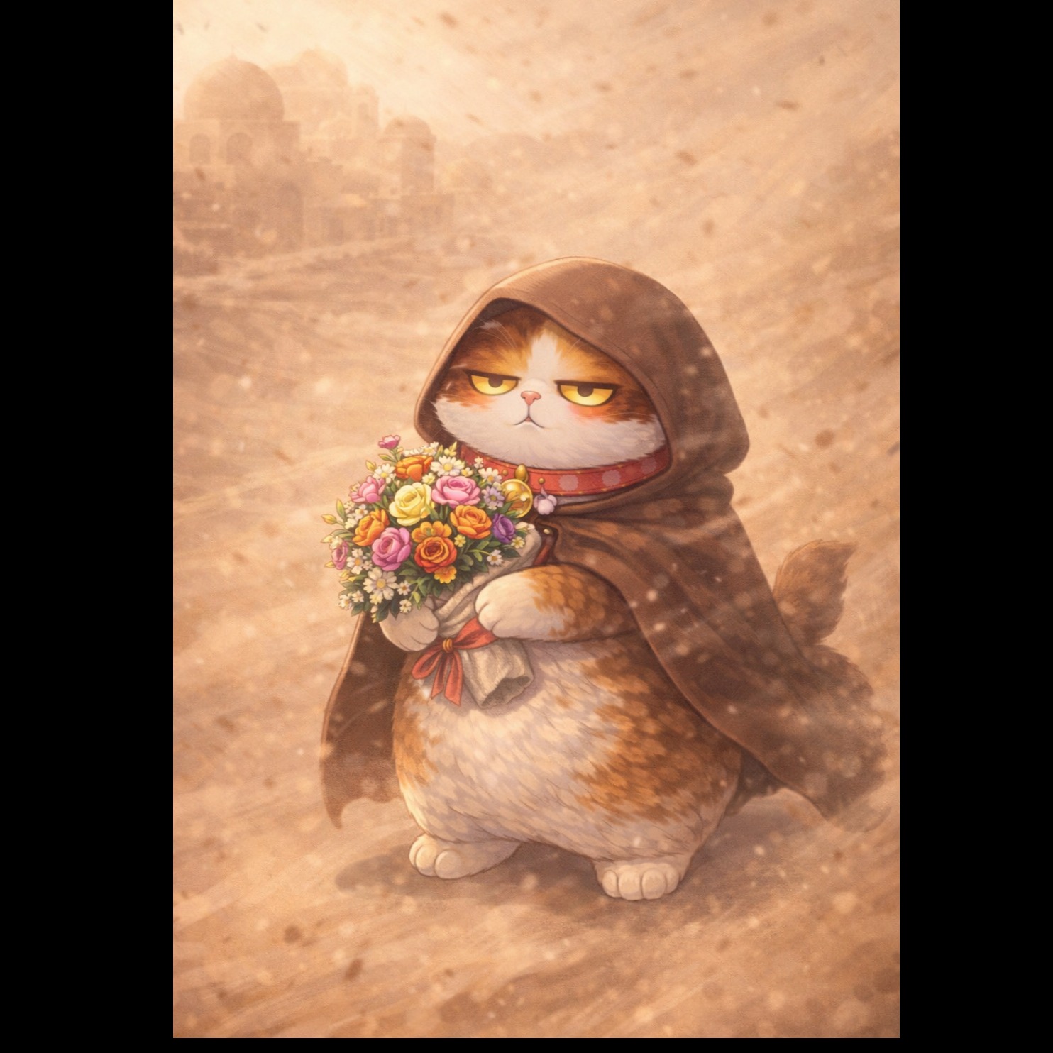 Stronger Chinese oriental character, Bring erhu forward as emotional lead instrument with deep expressive vibrato and answering phrases between vocal lines, More guzheng presence with rhythmic plucked patterns and dramatic glissando transitions, Add airy xiao bamboo flute melodic echoes in the background creating desert atmosphere, Use pentatonic scale feeling more clearly in instrumental lines, Reduce western cinematic string dominance and make strings more supportive and mid-focused, Introduce dry tribal frame drum pulse and low war drum accents instead of modern drum kit, Create ancient Silk Road travel mood, spiritual and poetic, Maintain wide space and delicate dynamics but increase ethnic texture density, Mythic folk orchestral expansion toward final half-time chorus