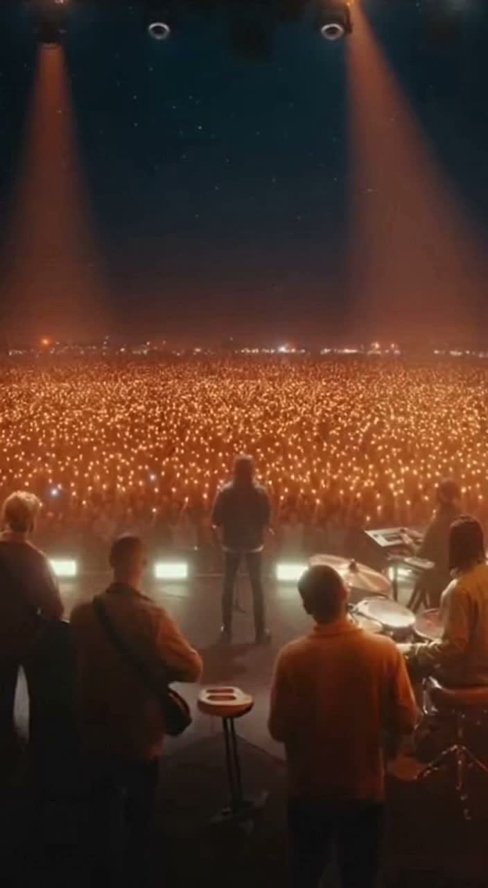 High-energy arena pop with live concert atmosphere, 110–120 BPM, driving drums, bright electric guitars, punchy bass, and layered synths, Male group vocals with powerful delivery, tight harmonies, and crowd interaction moments, Include live crowd ambience with cheering, clapping, and call-and-response energy, Verses are rhythmic and energetic, pre-chorus builds intensity, chorus is massive, anthemic, and chant-like, Production should feel like a live stadium performance with wide sound, reverb, and audience participation