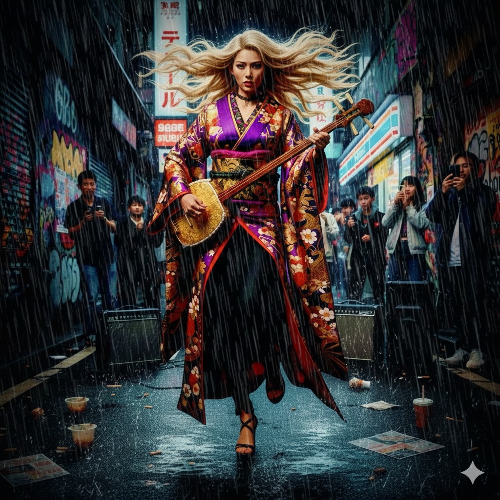 Static and loud, soft and explosive progress, Electric Drums: Wadaiko influenced, freestyle, Baritone saxophone: brows bass line, passionate groove, Electric-thick-neck shamisen: acting lead part, aggressive and solid high tone attack, uplifting phrasing, Cello: Celtic, only boost the shamisen sound, 17-string koto: plays like stroke riffs, Fuzzy and swing phrasing, enhances harmonies and dynamics, Vocal: Female, British accent, J-alternative emo influenced, wide range and style, spoken, whisper, belting, raspy, SFX: stormy and rainy wether, thunder strikes, wagakki, EQ: shamisen and vocal clarity, Ghost beat: acceleration and uplifting the chorus part to the end, Groove: R&B and hyper energetic