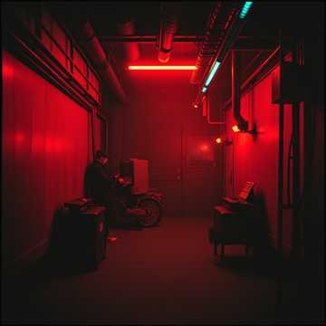 Style: dark breakbeat neuro-dub, 94 BPM, Heavy, murky, almost claustrophobic, Sound: deep, pressurized sub swells; gritty wobble fragments; stuttering glitch clicks; corrupted circuit noise; ghost-plucks with short decay; distant machine hum; shifting analog pads with no melodic phrasing, Add tape dust, servomotor chatter, voltage pops, Drums: dusty, broken funk breakbeat; tight punch kick; sharp, dry snare; metallic hat ticks; unstable ghost notes; occasional micro-glitch fills for tension, Atmosphere: dim lab, red status LEDs, memory stacks spinning, machinery breathing slow, Vocal elements: very sparse processed lab-log or PA fragments—distorted, bit-crushed, abstract only, Mood: shadowy, mechanical, introspective; like an android rebooting alone in a dark room