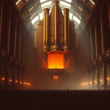 Cathedral pipe-organ with vowel choir (no words), G Phrygian color, slow procession 60–70 BPM, Melody built from descending cells that reset upward by octave, Constant C pedal; occasional D♭ “toll” (♭II) before returning to i, Choir is phonetic air: long “Ah / Oh” vowels with pre-delay so the room blooms, Industrial low drones and distant metal tolls—no drum kit, The “cathedral drop” happens when the organ opens its full ranks in a higher register