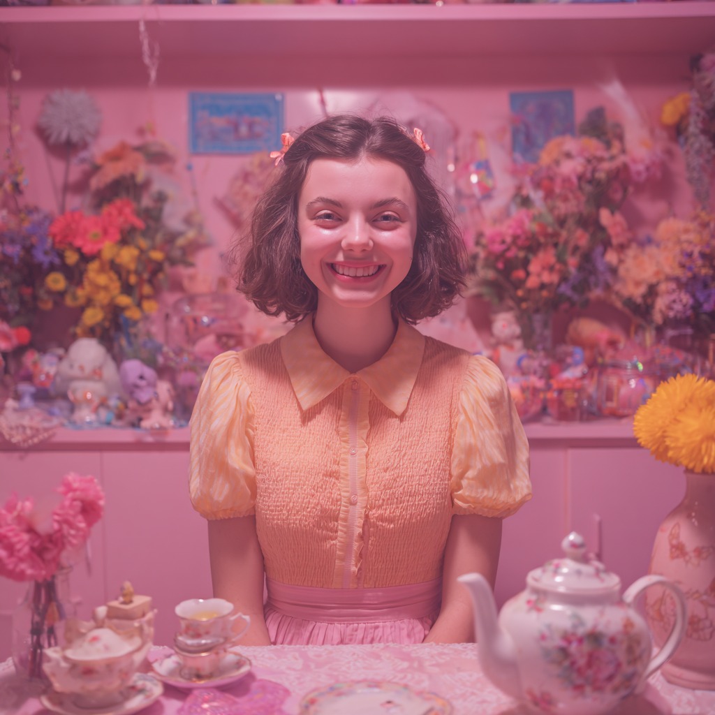 Bright pop punk with cheerleader chant energy crossed with Disney villain showtune, female vocals full-chest belt throughout, sugar-coated and manic, never drops below high energy, Crunchy major-key power chord guitars, fast 16th-note hi-hats, driving bass, stacked harmony "hey!" shouts in intro and bridge, Layered vocal harmonies on bridge stacking the same phrase as a one-woman choir, Final chorus modulates up a whole step for added soaring intensity, 168 BPM, 4/4, key of C major modulating to D major on final chorus, Outro strips to single dry close-mic vocal with zero processing, Garage pop punk production, vocal-forward, no autotune, real drums, no synths, the brightness is the horror