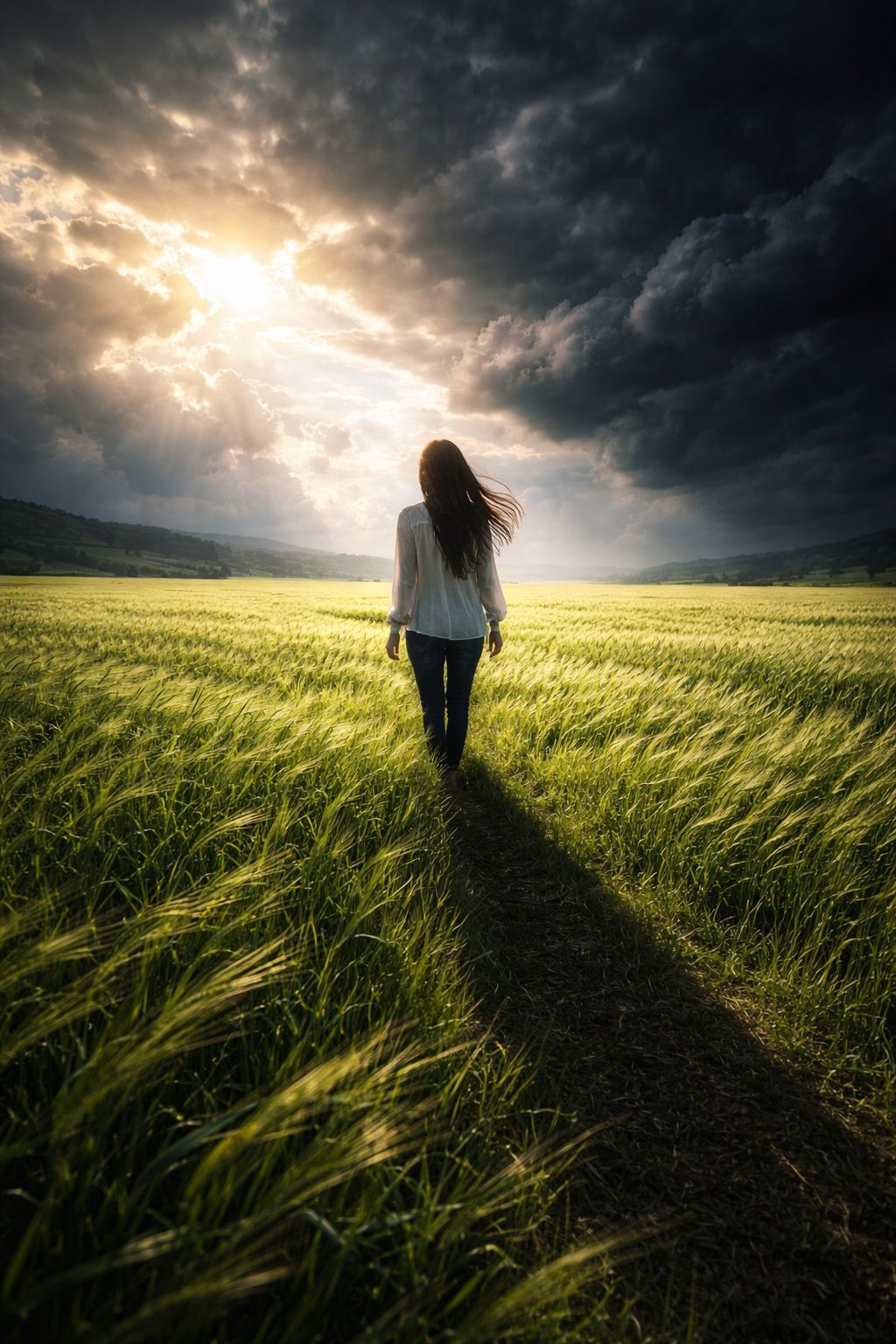 The song begins in vast silence, with wind ambience, low piano and cello, evoking a dry and endless plain before dawn, Female lead vocal, calm and restrained, delivering the lyrics like a testimony rather than an emotional confession, Tempo starts slow around 70 BPM, steady and patient, gradually building tension, Pre-chorus introduces subtle string pads, symbolizing unextinguished faith, Chorus expands with full strings and measured drums, dignified and prophetic, not sentimental, Second verse flows like time and rivers carving stone, with deeper orchestration, Bridge strips back to near silence, breath and low strings, as if standing at the center of the wilderness, Final chorus opens completely into symphonic rock with choir-like backing vocals, representing the opening of the sky and the sound of hooves across history, Mood is resolute, timeless, declarative, and hopeful