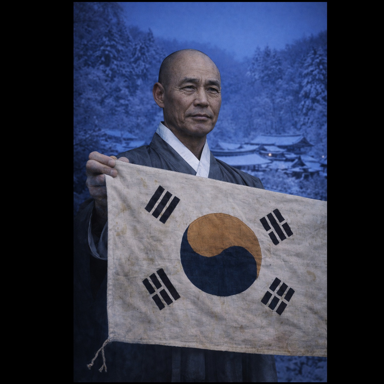 Poetic Symphonic Protest Metal, Korean lyrics, Intro 70 BPM wind ambience, deep male spoken calm narration, Verse restrained female vocal, firm low register, minimal reverb, forward mix, Gradual build to 120 BPM chorus, full band entry, Final shift 140 BPM with double kick and orchestral explosion, Female vocal (Yeoni style): piercing sustained high notes that cut through distorted guitars, controlled grit, no screaming, no growl, no harsh distortion, strong projection without shouting, slightly delayed bends, emotional restraint with penetrating tone, Male vocal: deep cinematic narration, powerful clean declaration in climax, Choir: mixed male/female chanting final line, Instruments: cinematic strings, brass stabs, drop-tuned guitars, militant snare, strong low end, High dynamic range, wide stereo field, clear vocal separation, no muffled or washed-out mix, Mood: pastoral beauty turning into restrained resistance and explosive declaration