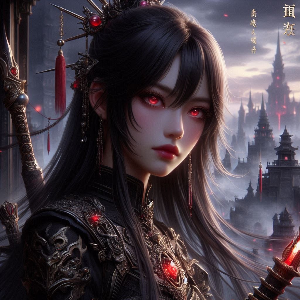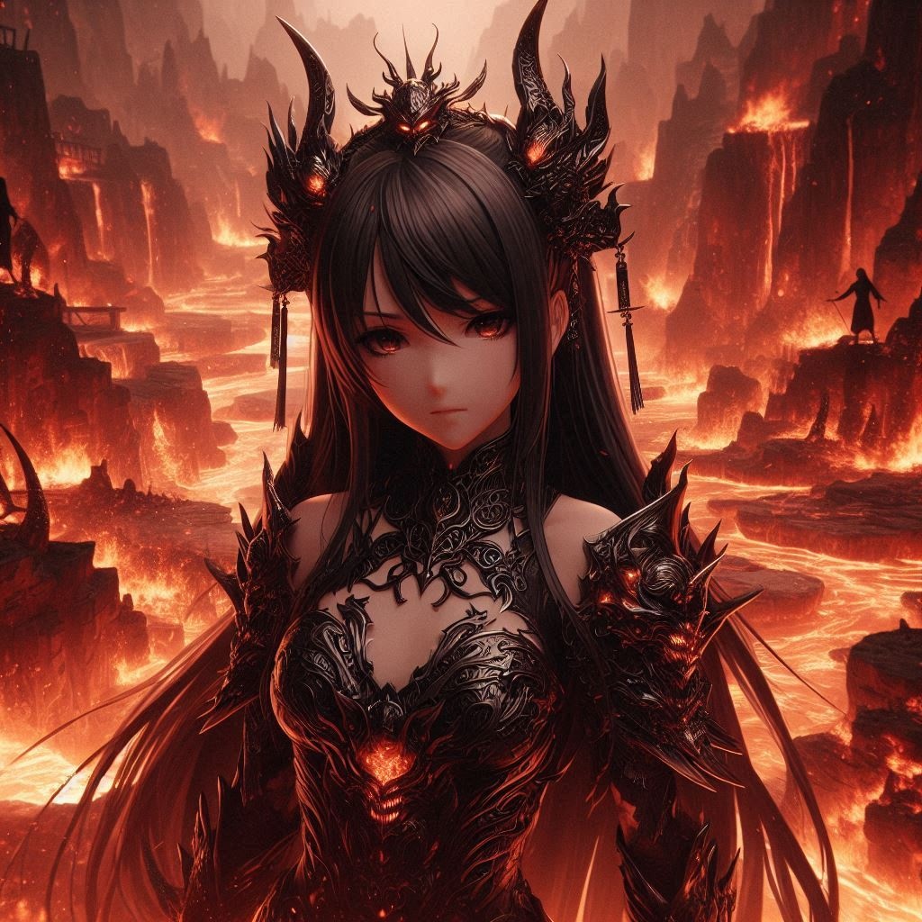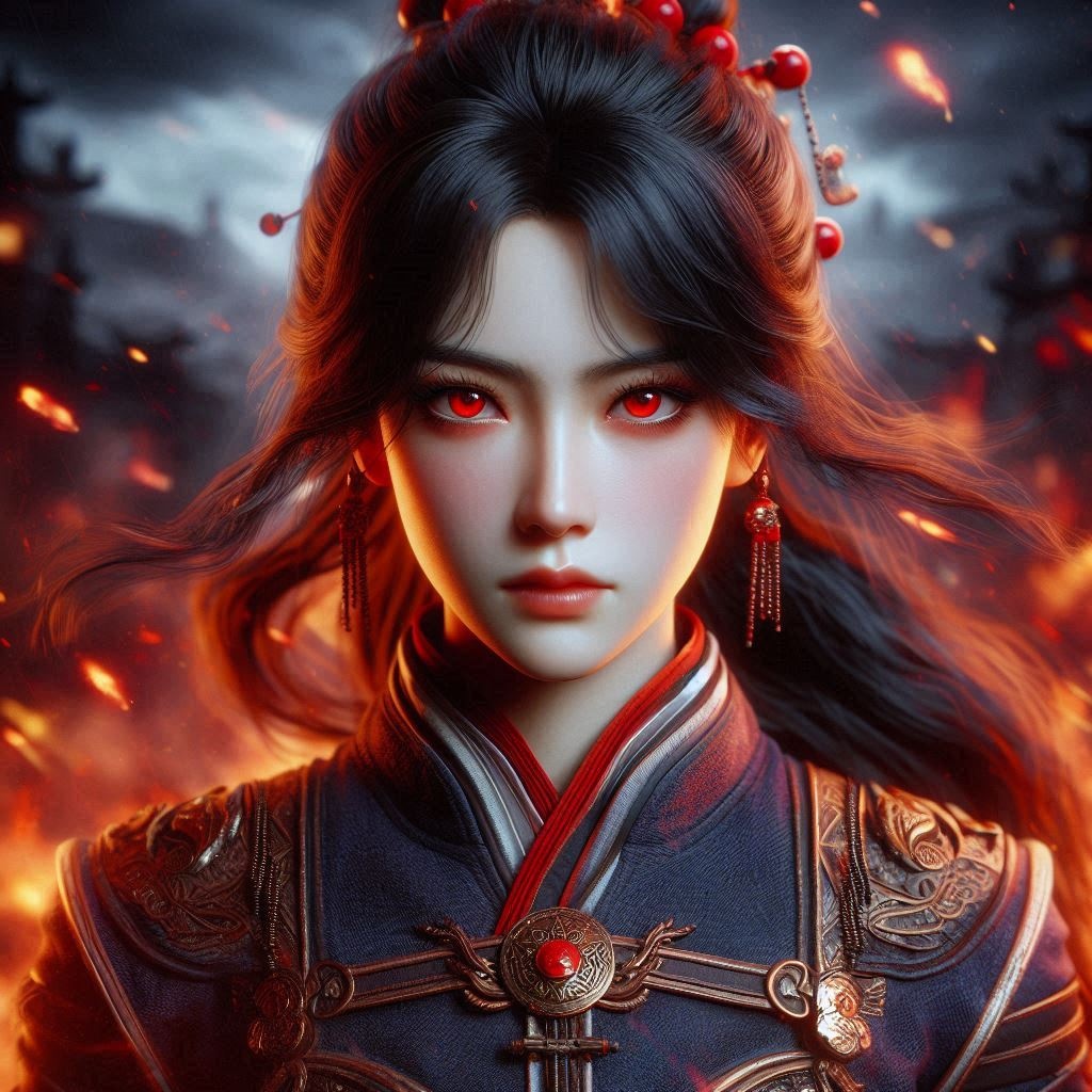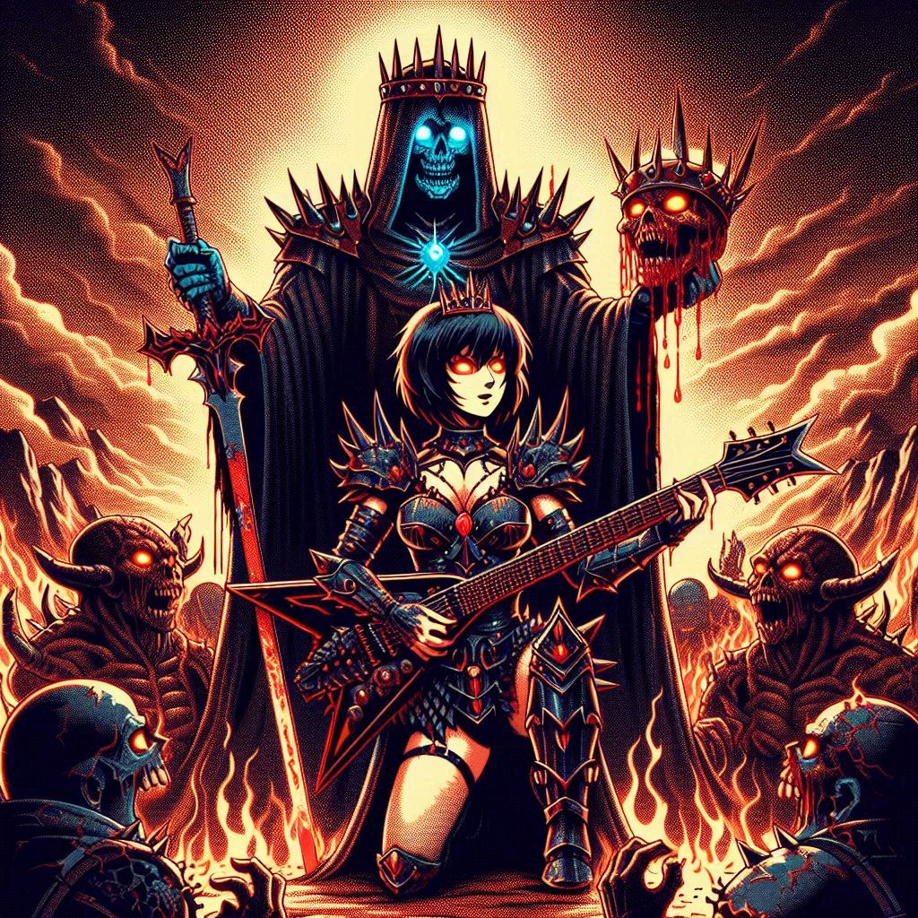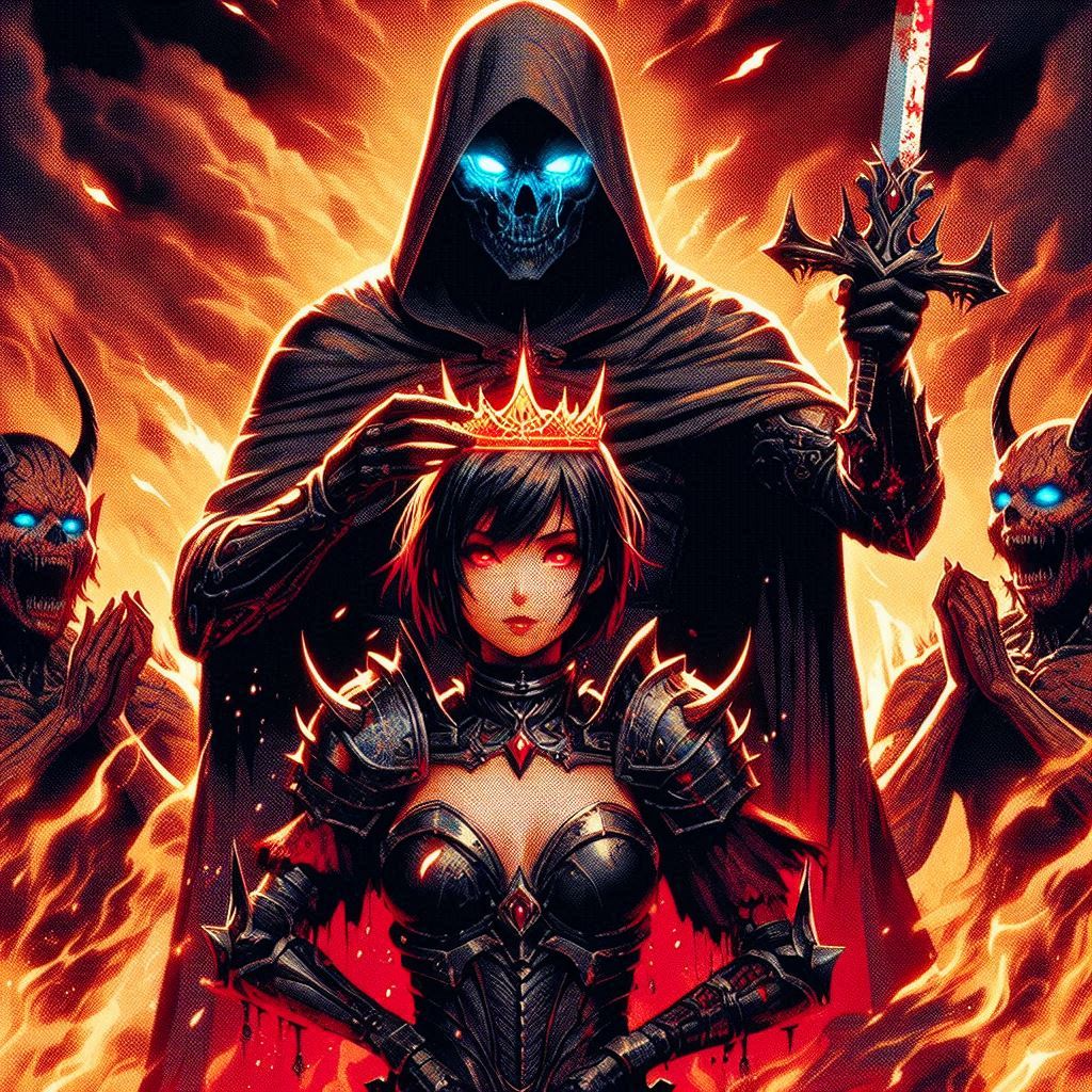 A powerful fusion of '80s hair metal and slamming brutal death metal, Shredding guitar solos, thunderous double-kick drums, gritty vocals in the verses with brutal death growls in breakdowns, Anthemic chorus with soaring power metal flair, Lyrics about an unstoppable flame — a fierce warrior queen crowned in chaos, backed by a silent shadow warrior, No love song, just pure strength, fury, and epic glory
