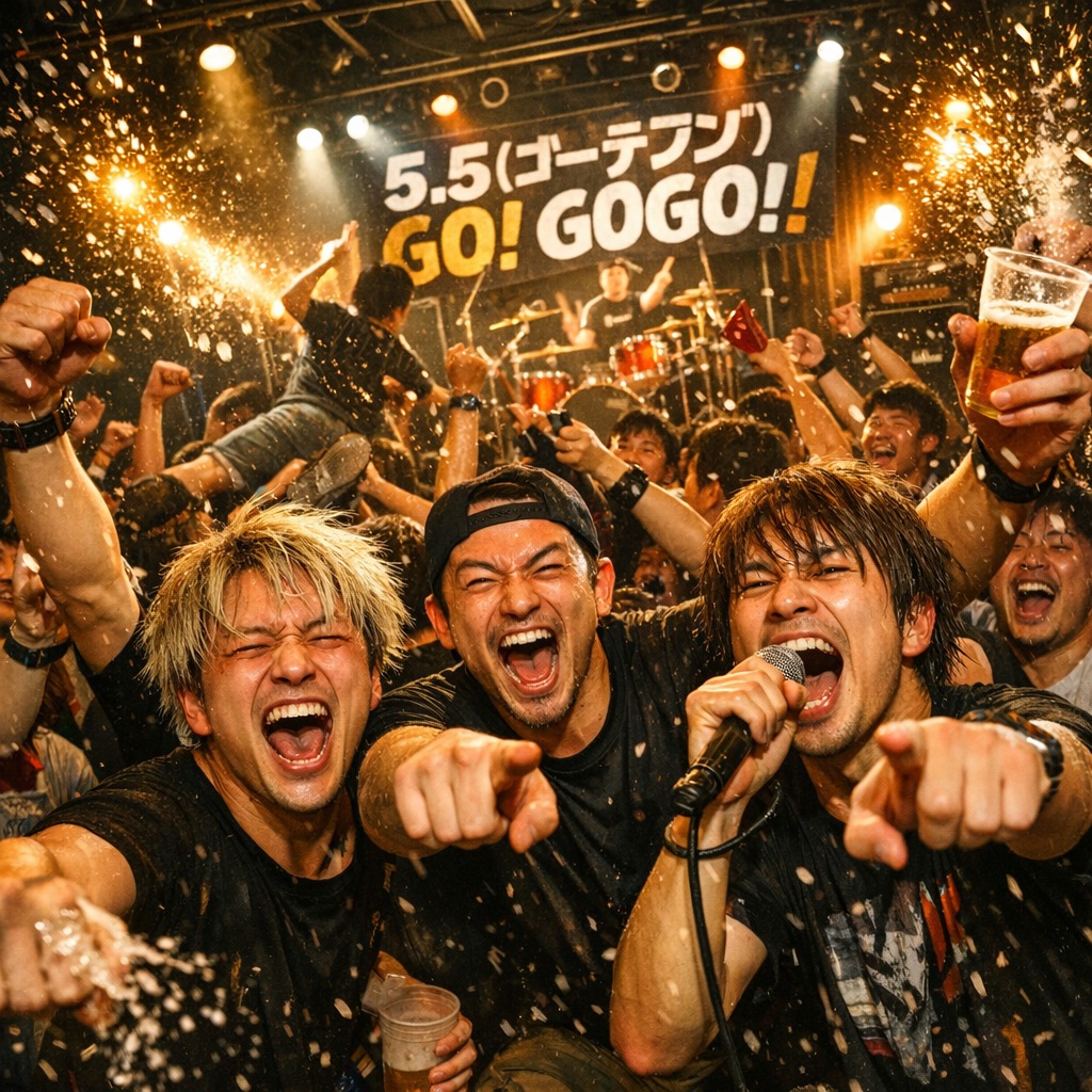 High‑energy EDM × rock hybrid, Fast BPM, heavy kick, thick bass, Shouting vocals, call‑and‑response crowd energy, Simple catchy chants, explosive drop, Live‑house atmosphere, big room impact