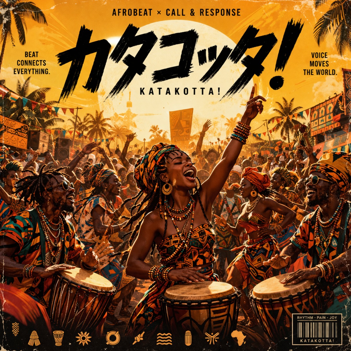high energy afrobeat, uptempo 124 BPM, heavy percussion, conga shakers, talking drum patterns, hand percussion break, chant-driven vocals, call and response, chopped vocal hooks, wide stereo percussion, party atmosphere, chaotic lift, dancefloor pulse, festival afrobeat, crowd shouts, nonstop rhythm
