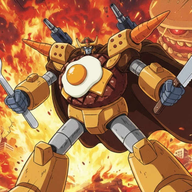 Super hot-blooded Japanese hero rock, very energetic tempo, thick distorted guitars, pounding live drums, shouted vocals, wrestling entrance music vibe, tokusatsu opening theme, food-themed battle song, exaggerated emotions, crowd chant focus, funny but extremely intense