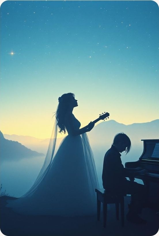 indie pop soft ballad, #vocal:Male very very softly voice #vocal: epic choral of kids in chorus, #instruments :accoustic guitar 12 chords, soft piano, distant cello, smooth and distant smooth percussion #Mood: melancholic, sad, lullaby #hook image : shadows of lovers on paradise_ with stars_ realistic style detail