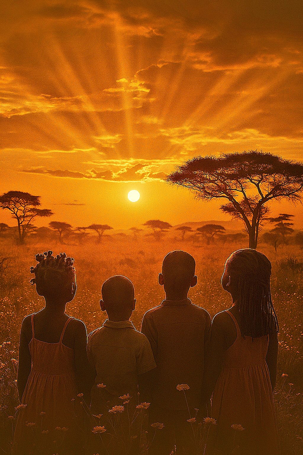 indie folk ballad, #vocal:Male very softly voice whispered with choral of kids, #instruments :accoustic guitar 12 chords, soft piano, distant cello, smooth and distant percussion #Mood: melancholic, sad, lullaby #hook image : shadows of lovers in African village _realistic_with stars_ realistic style detail