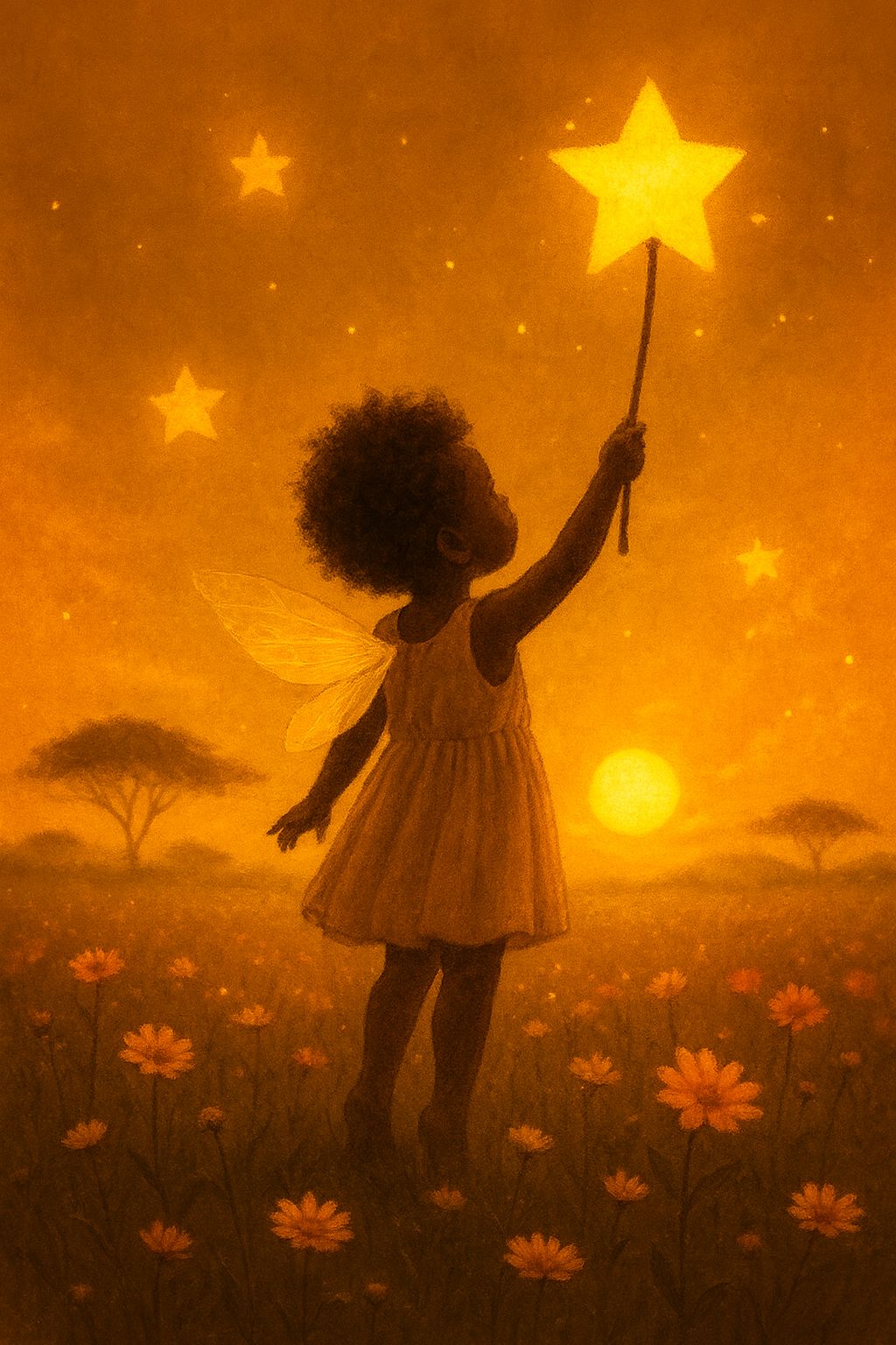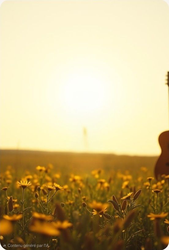 indie folk ballad, #vocal:Male very softly #vocal : choir of kids whispered voice, #instruments :accoustic guitar classic 12 chords, soft piano, distant cello, smooth and light violon #Mood: melancholic, sad, lullaby #hook image : the back of a little girls in a field of dasy looking at stars _ with stars shape_ realistic style detail